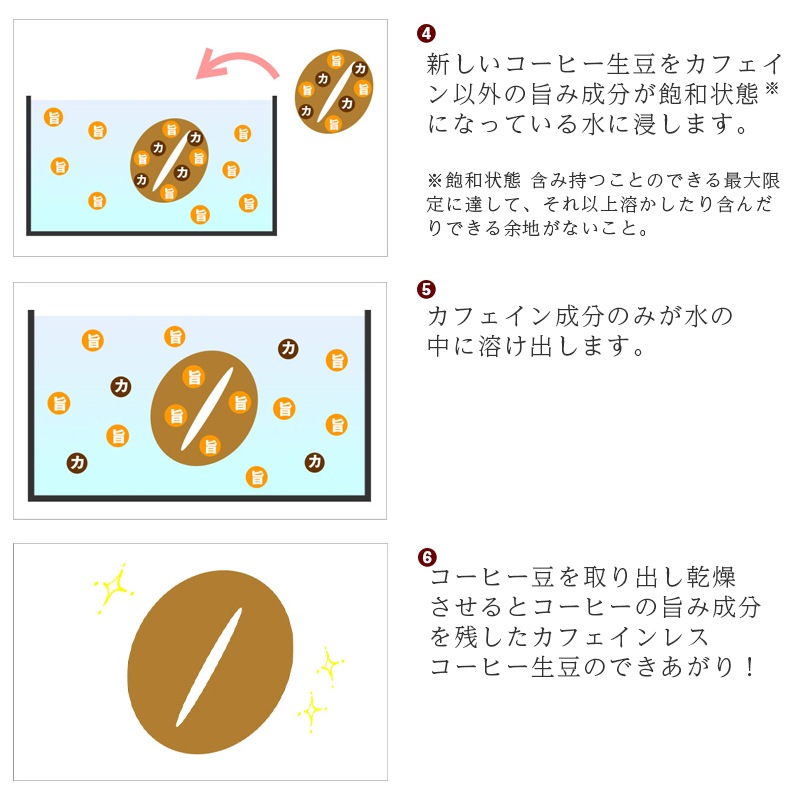 ![]() 新しいコーヒー生豆をカフェイン以外の旨み成分が飽和状態(※)になっている水に浸します。※飽和状態 含み持つことのできる最大限定に達して、それ以上溶かしたり含んだりできる余地がないこと。 |