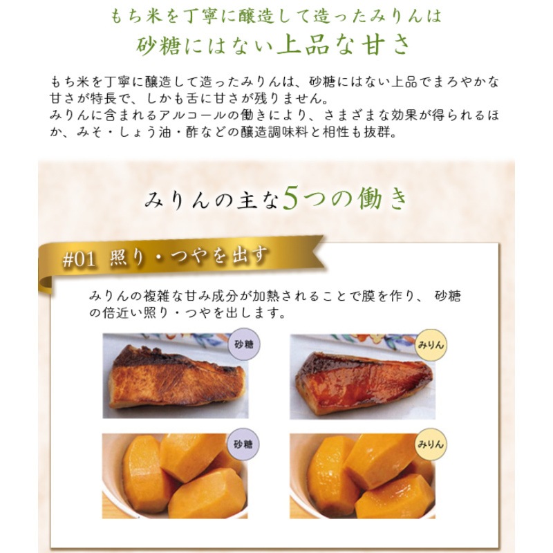みりんに含まれるアルコールの働きにより、さまざまな効果が得られる他、みそ・醤油・酢などの醸造調味料との相性も抜群。