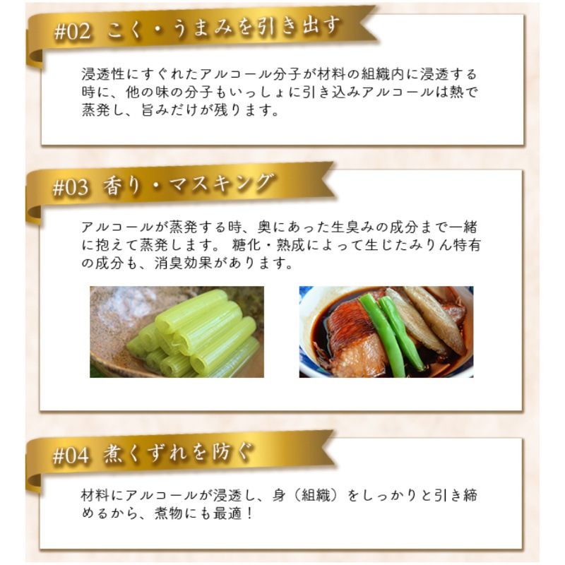 アルコールが蒸発するとき、奥にあった生臭みの成分まで一緒に抱えて蒸発します。糖化・熟成によって生じたみりん特有の成分も。消臭効果があります。