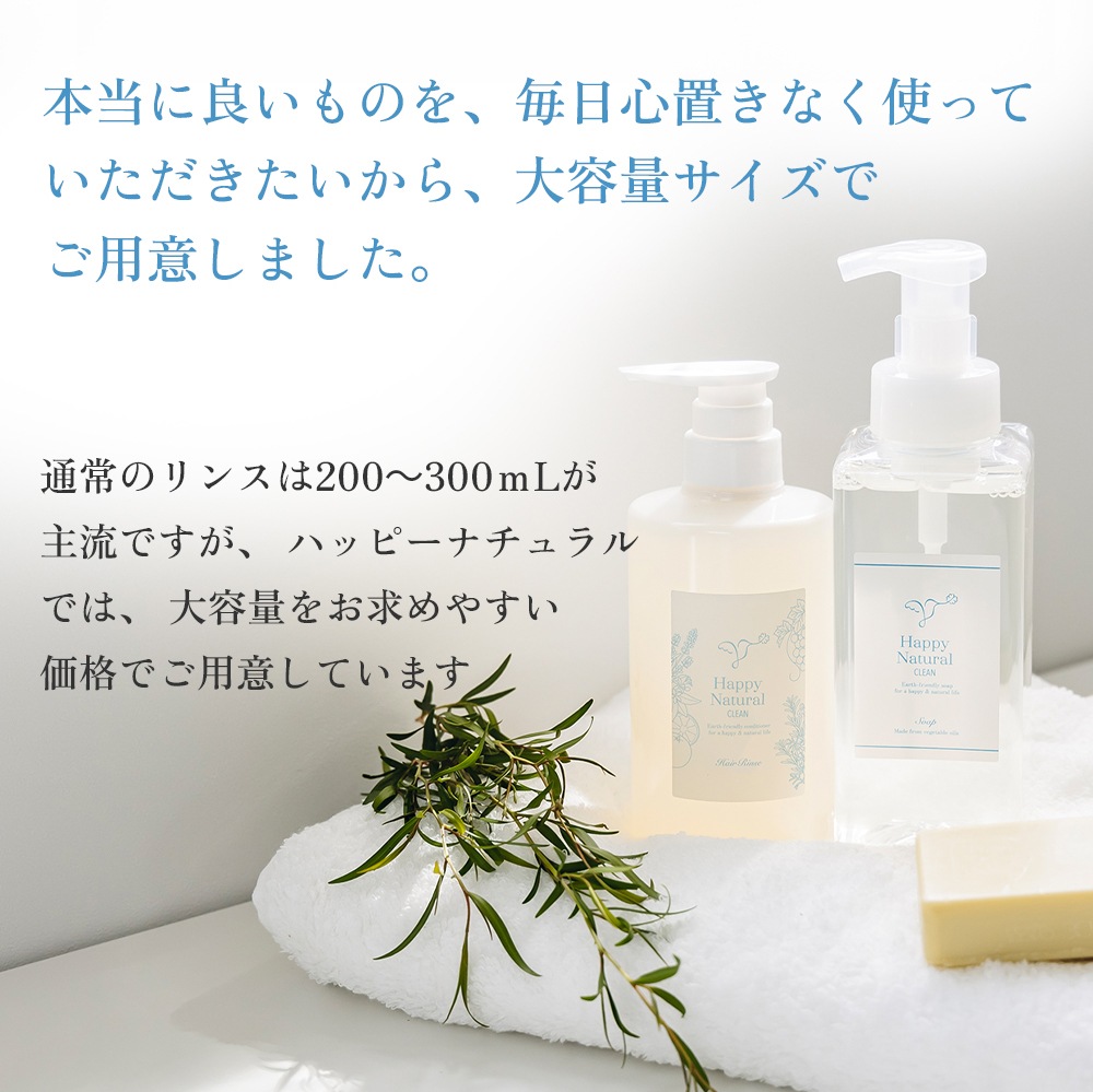 通常のリンスは200~300mLが主流ですが、 ハッピーナチュラルでは、 大容量をお求めやすい価格でご用意しました。