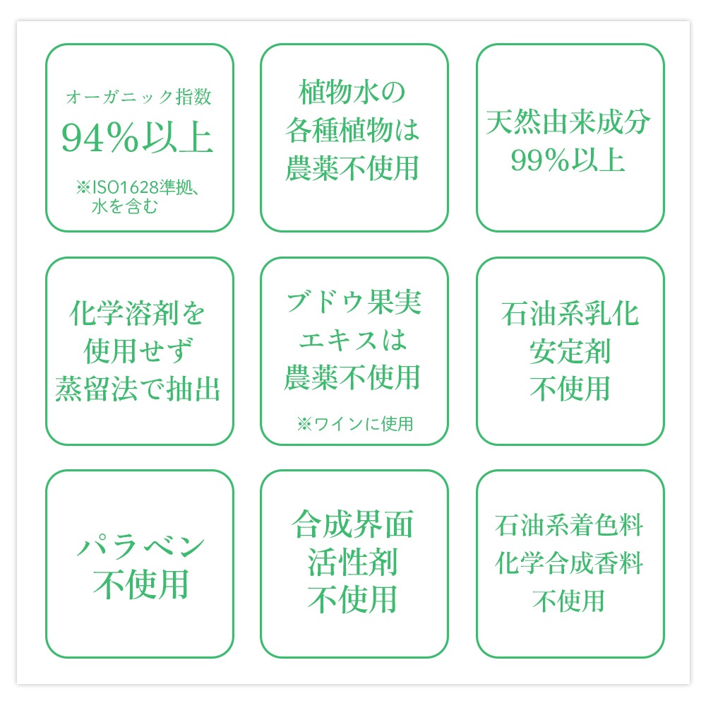 水(精製水)、カミツレ水(長野県・無農薬)、ローズマリー水(長野県・無農薬)、ラ ベンダー水(長野県・無農薬)、グリセリン(日本・ナタネ/ダイズ/パーム由来)、クエ ン酸(鹿児島県・サツマイモ由来)、セイヨウイラクサ葉エキス(日本・天然由来)、ヨ ーロッパシラカバ葉エキス(日本・天然由来)、スギナエキス(日本・天然由来)、セイ ヨウノコギリソウ花エキス(日本・天然由来)、セージ葉エキス(日本・天然由来)、フ キタンポポ葉エキス(日本・天然由来)、ミツガシワ葉エキス(日本・天然由来)、ロー ズマリー葉エキス(日本・天然由来)、ブド ウ発酵エキス(山梨県・有機JAS)、グアーガム(タイ・エコサート有機認証)、キサ ンタンガム(USA・エコサート有機認証)、フェノキシエタノール(日本)、マンダリ ンオレンジ果皮油(イタリア・オーガニック)、BG※1(天然植物由来)、PG※1(天然植物由来)