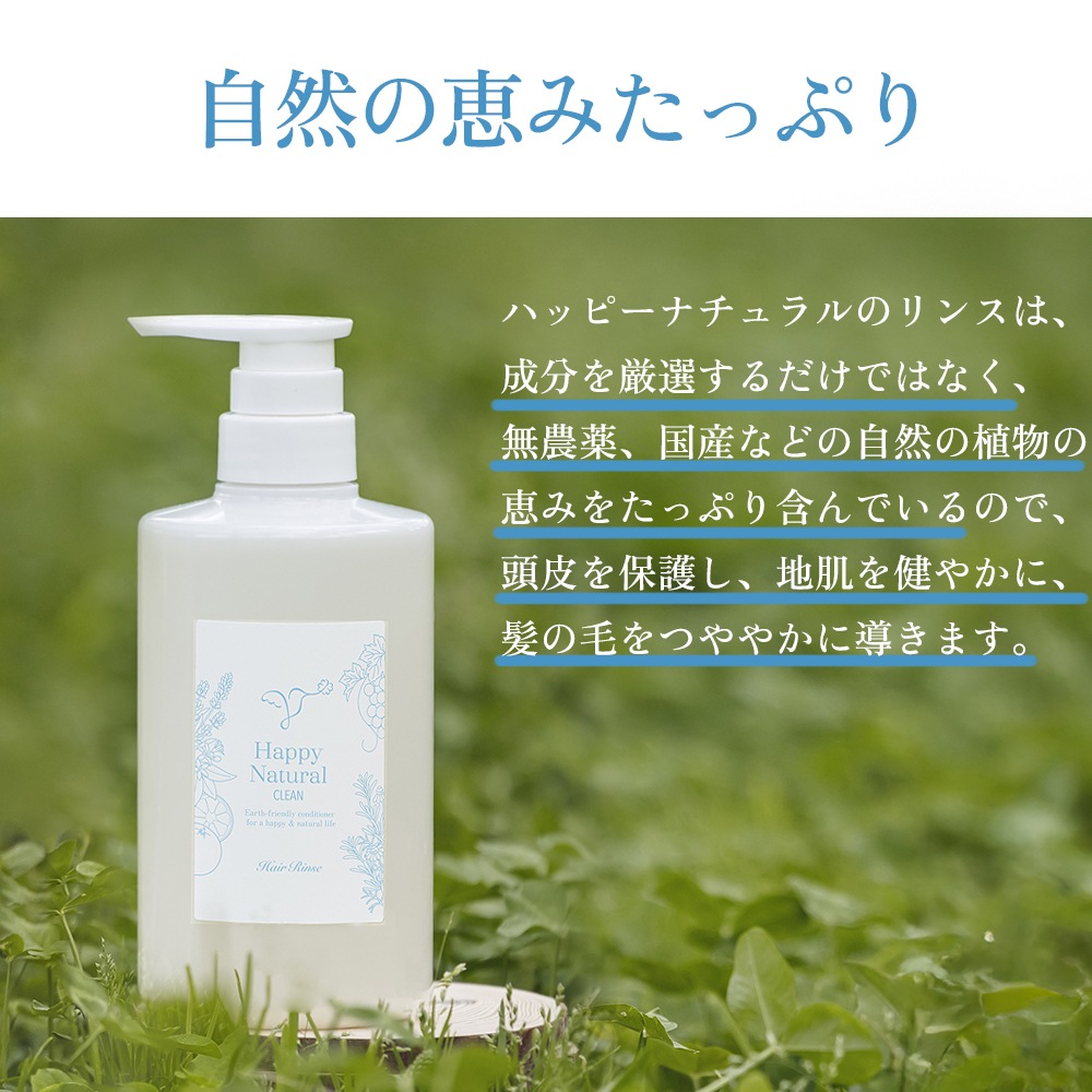ハッピーナチュラルのリンスは、成分を厳選するだけではなく、無農薬、国産などの自然の植物の恵みをたっぷり含んでいるので、頭皮を保護し、地肌を健やかに、髪の毛をつややかに導きます。