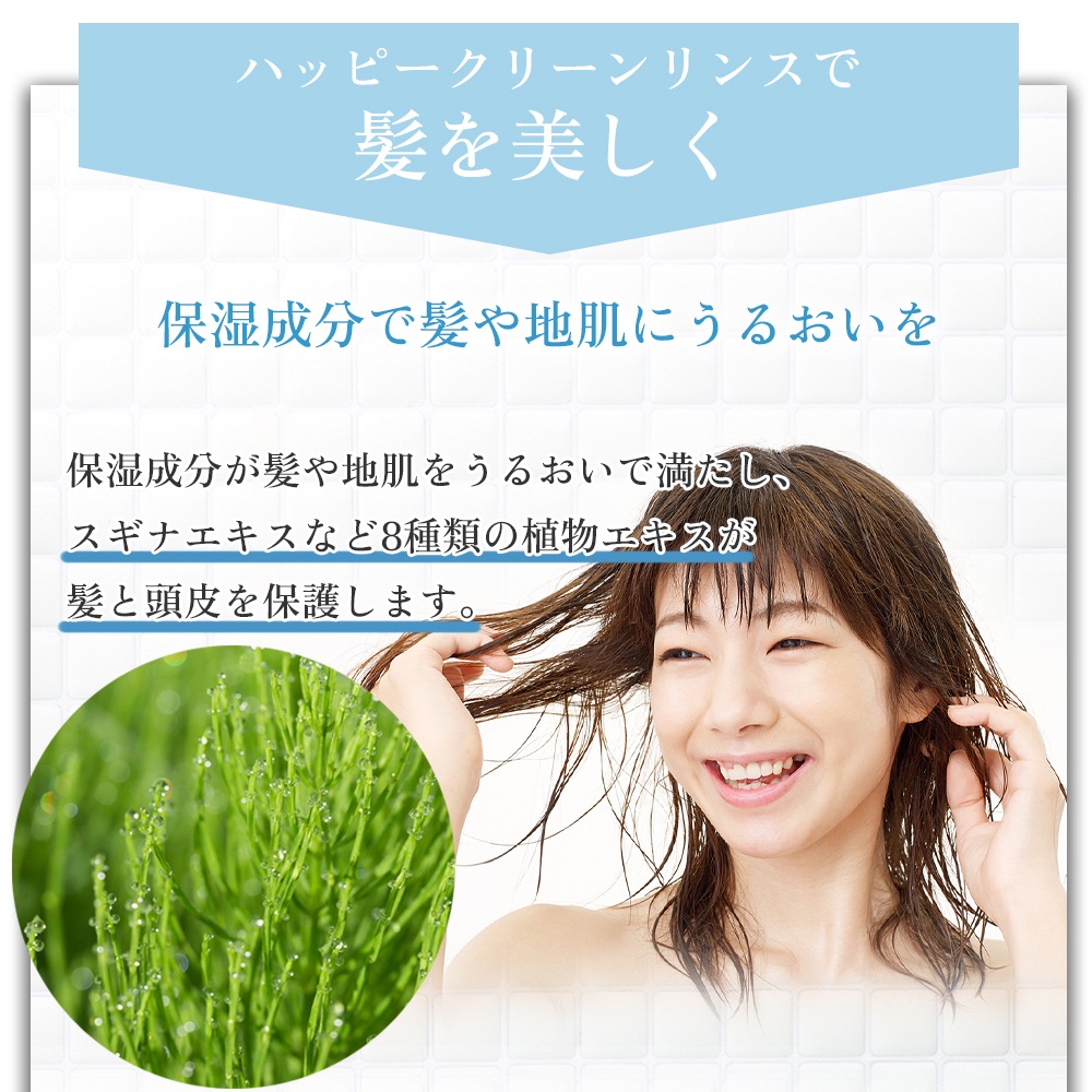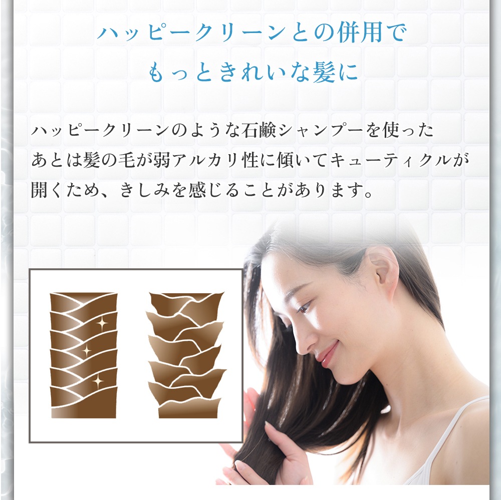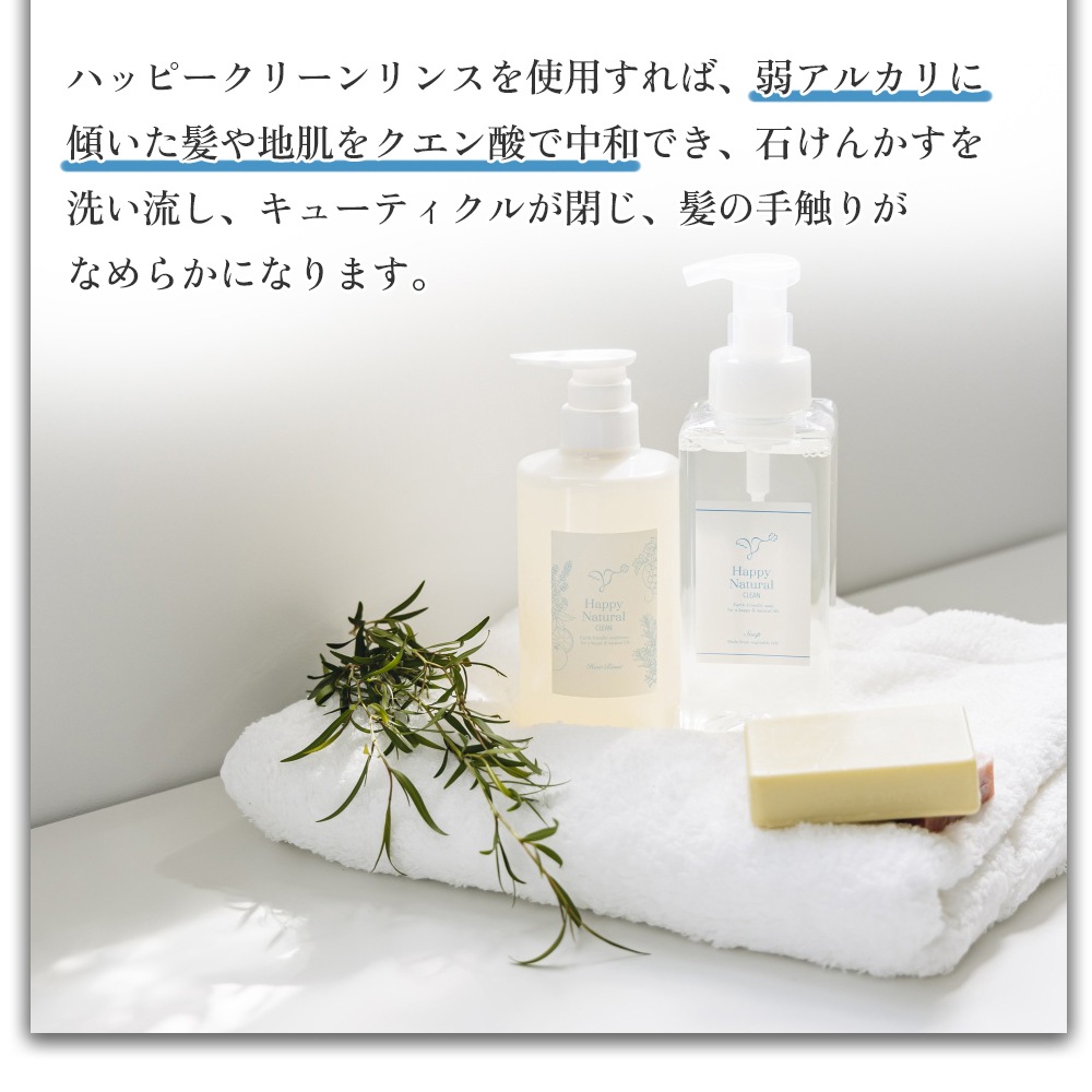 ハッピークリーンリンスを使用すれば、弱アルカリに傾いた髪や地肌をクエン酸で中和でき、石けんかすを洗い流し、キューティクルが閉じ、髪の手触りがなめらかになります。