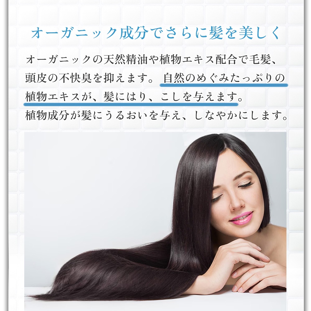 オーガニックの天然精油や植物エキス配合で毛髪、頭皮の不快臭を抑えます。 自然のめぐみたっぷりの植物エキスが、髪にはり、こしを与えます。 植物成分が髪にうるおいを与え、しなやかにします。