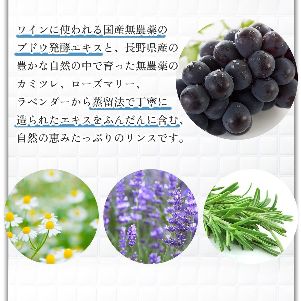 ワインに使われる国産無農薬のブドウ発酵エキスと、長野県産の豊かな自然の中で育った無農薬のカミツレ、ローズマリー、 ラベンダーから蒸留法で丁寧に造られたエキスをふんだんに含む、自然の恵みたっぷりのリンスです。
