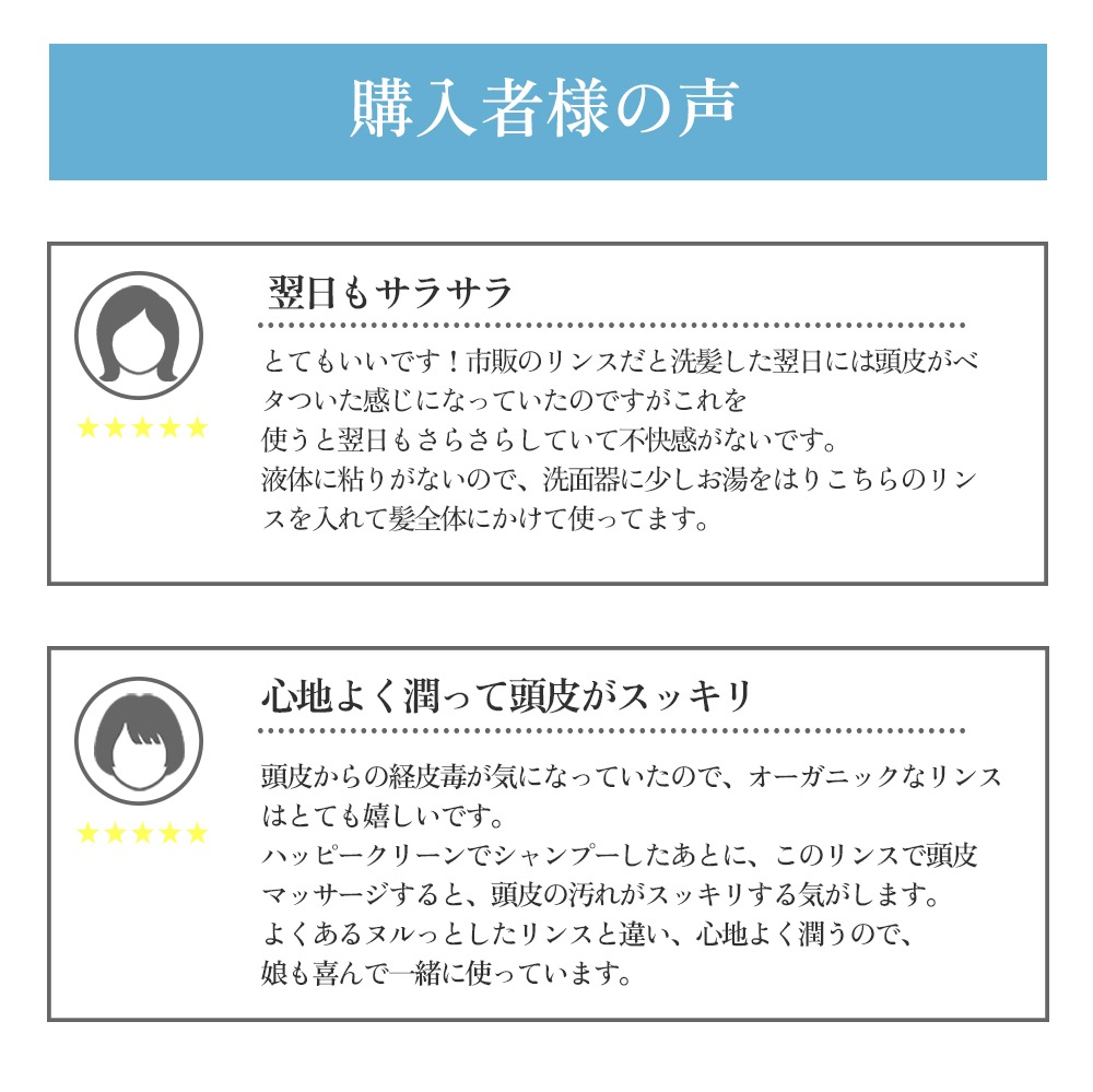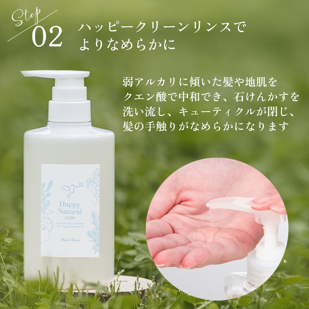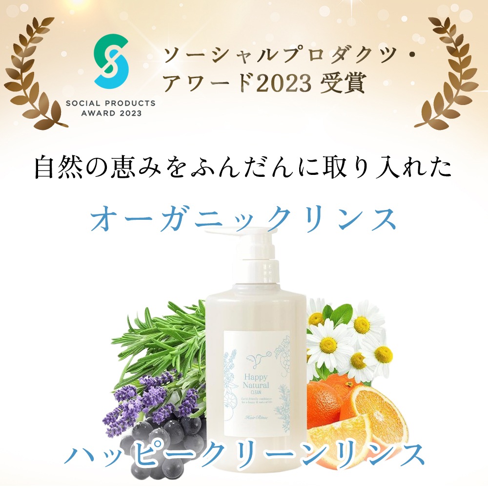 そのため原材料が良いことはもちろん、使い心地が良く、使ってみて幸せを感じる香りや、さわり心地の良い髪を叶えるナチュラルでいて最高の髪のためのリンスをお届けしたいという想いから、ハッピークリーンリンスを開発しました。