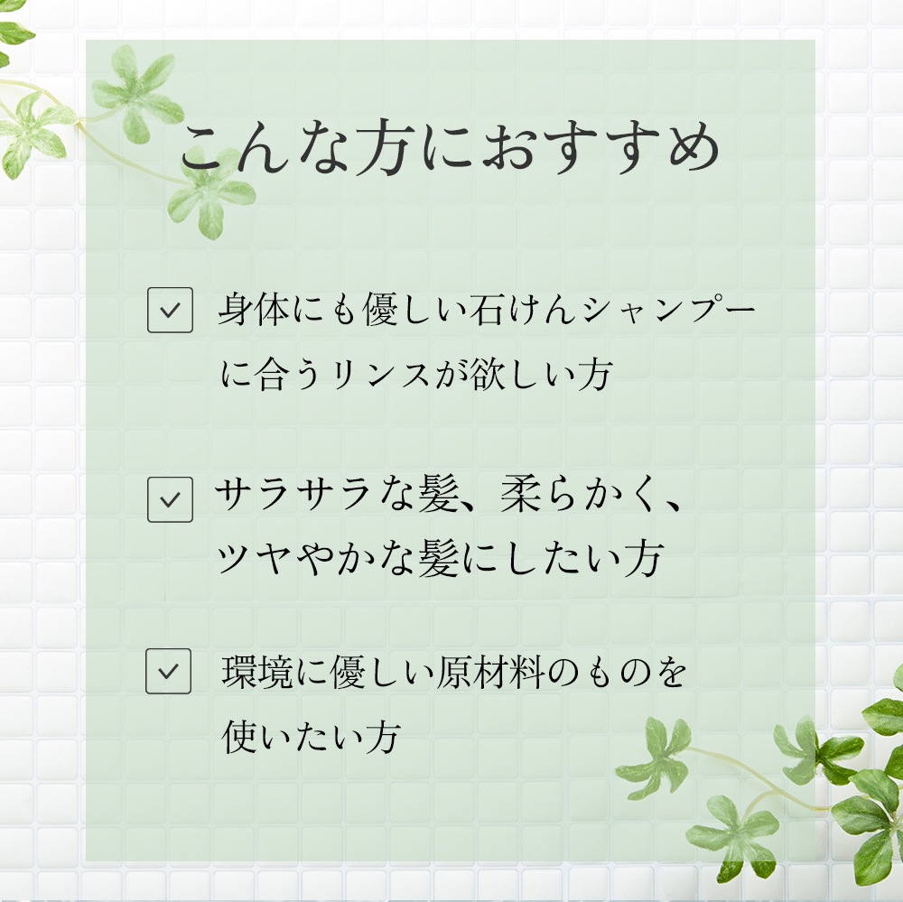 地球にも身体にも優しい石けんシャンプーに合うリンスが欲しいというご要望を多く頂いておりました。