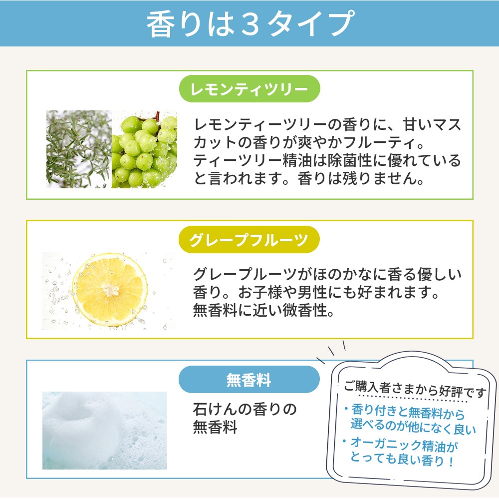 | レモンティーツリーの香りに、甘いマスカットの香りが爽やかフルーティ。 ティーツリー精油はスッキリ。香りは残りません。 | グレープルーツがほのかなに香る優しい香り。お子様や男性にも好まれます。 無香料に近い微香性。 |