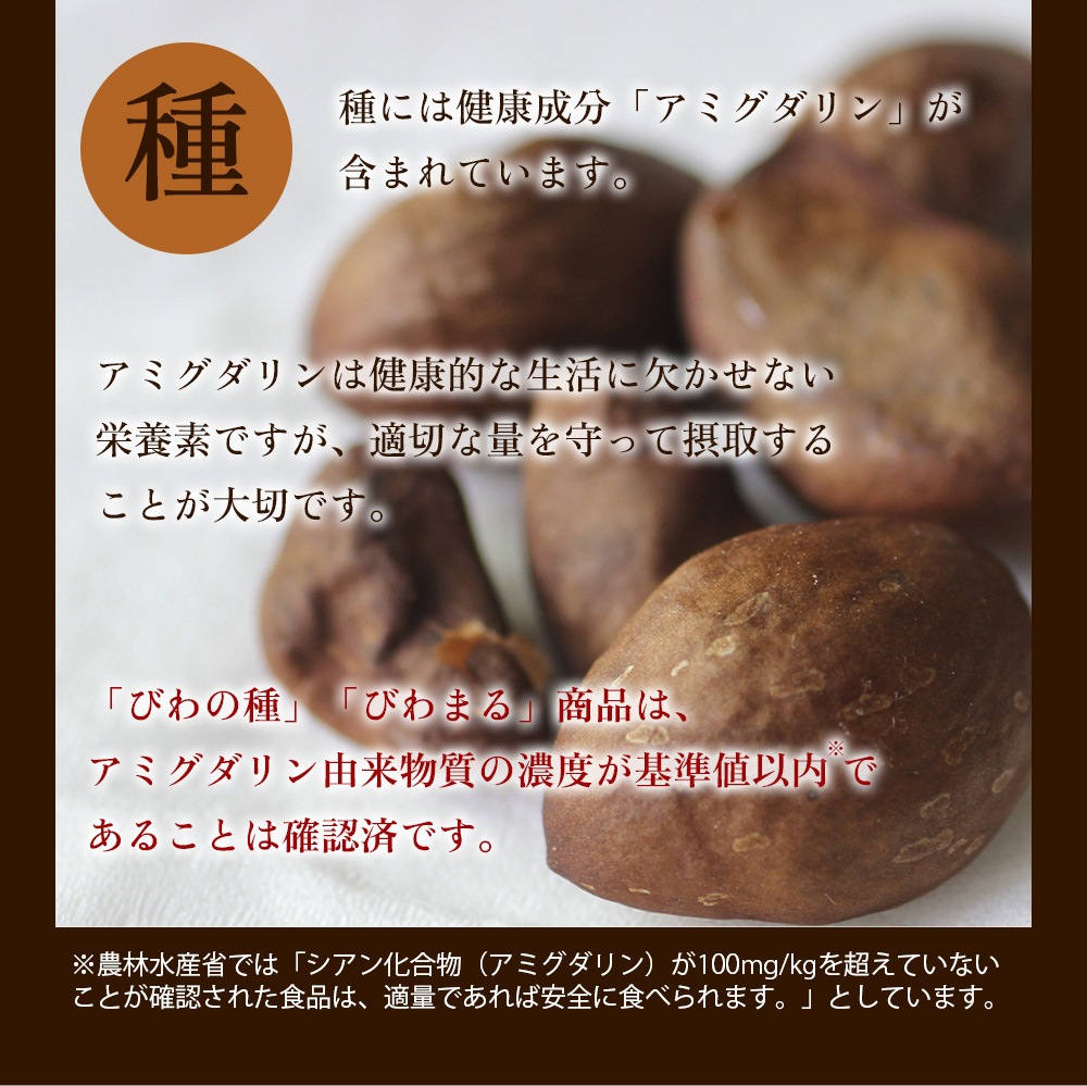 商品「びわの種」および「びわまる」は、原料となる種が10 mg/kgの基準値以下であることを確認してから製造されています。