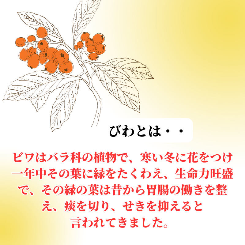 ビワの葉の成分は、ブドウ糖・蔗糖・果糖・マルトース・でんぷん・デキストリン・酒石酸・クエン酸・リンゴ酸・アミグダリン・タンニン・サポニンなどです。