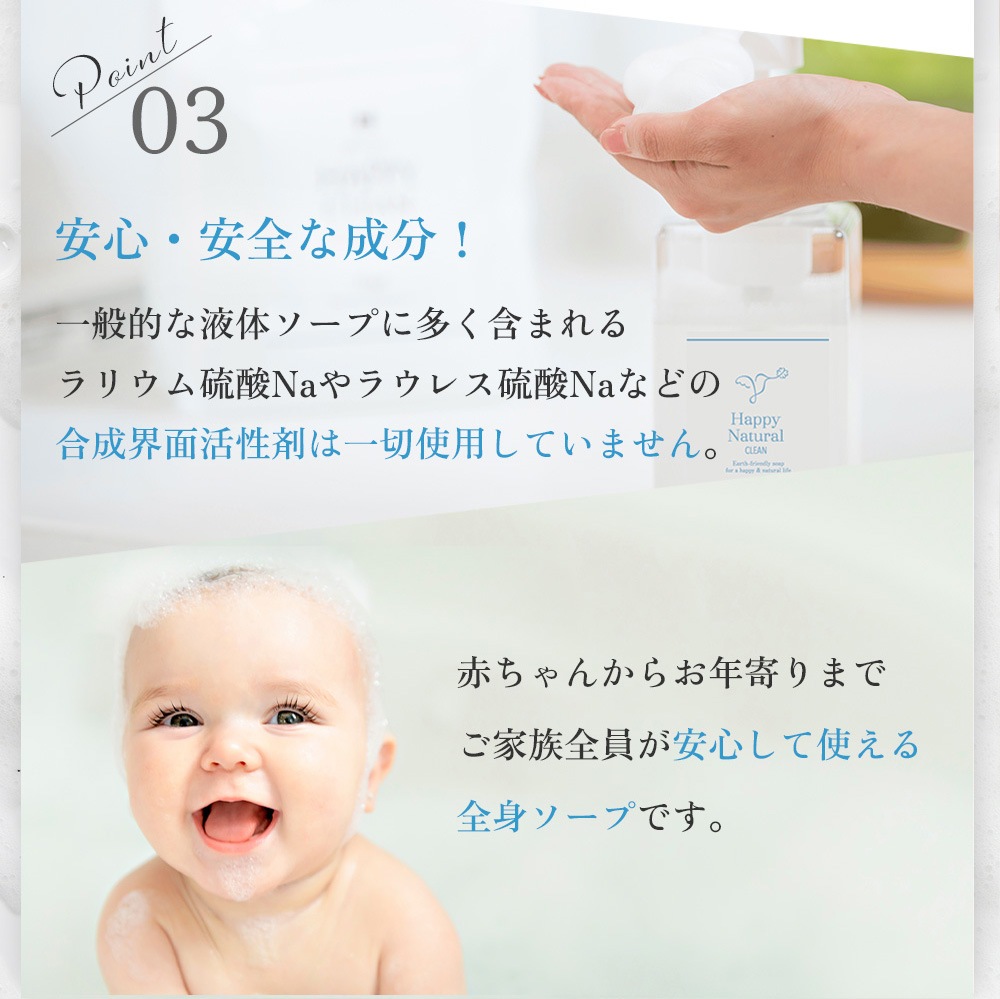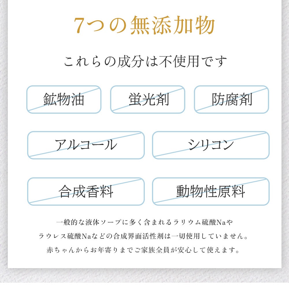 一般的な液体ソープに多く含まれるラリウム硫酸Naやラウレス硫酸Naなどの合成界面活性剤は一切使用していません。