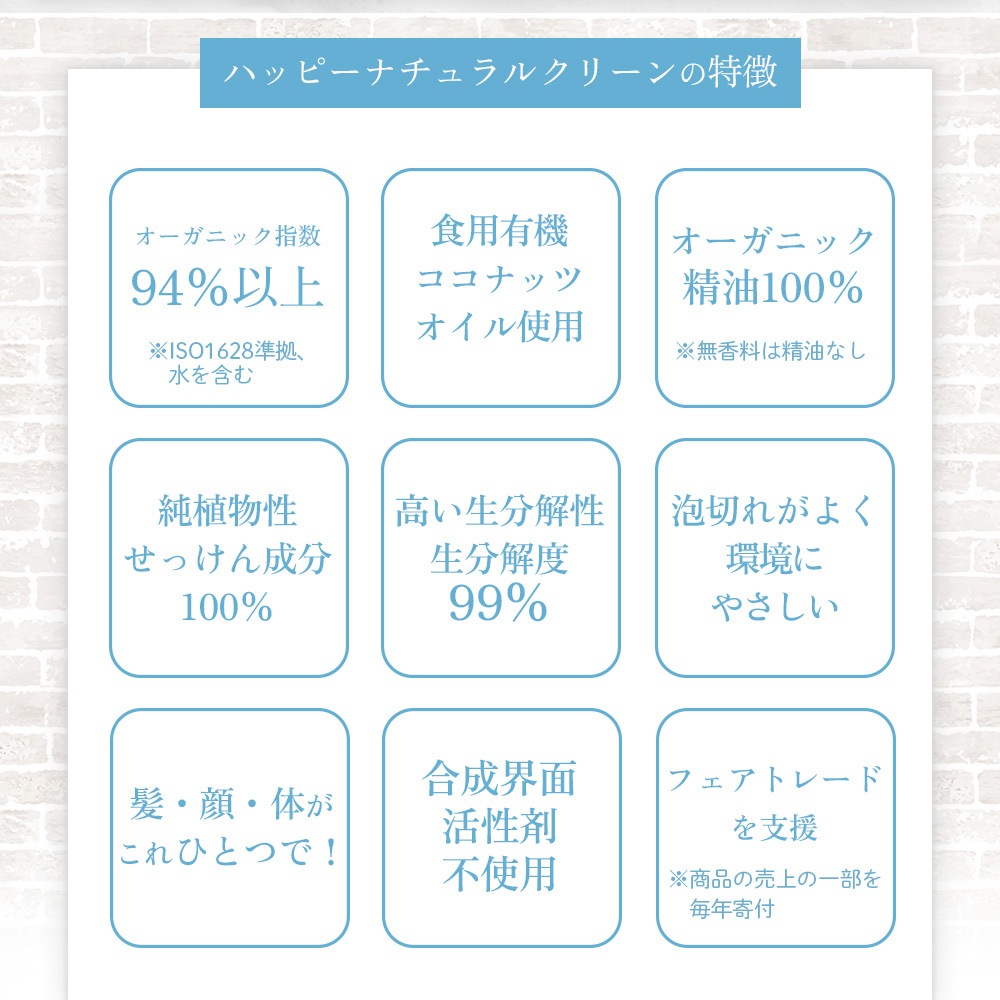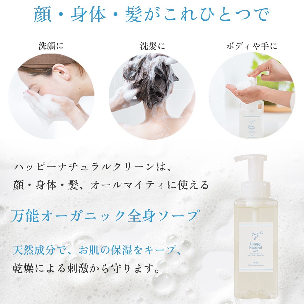 ハッピークリーンは、顔・身体・髪に使える万能オーガニックソープ。