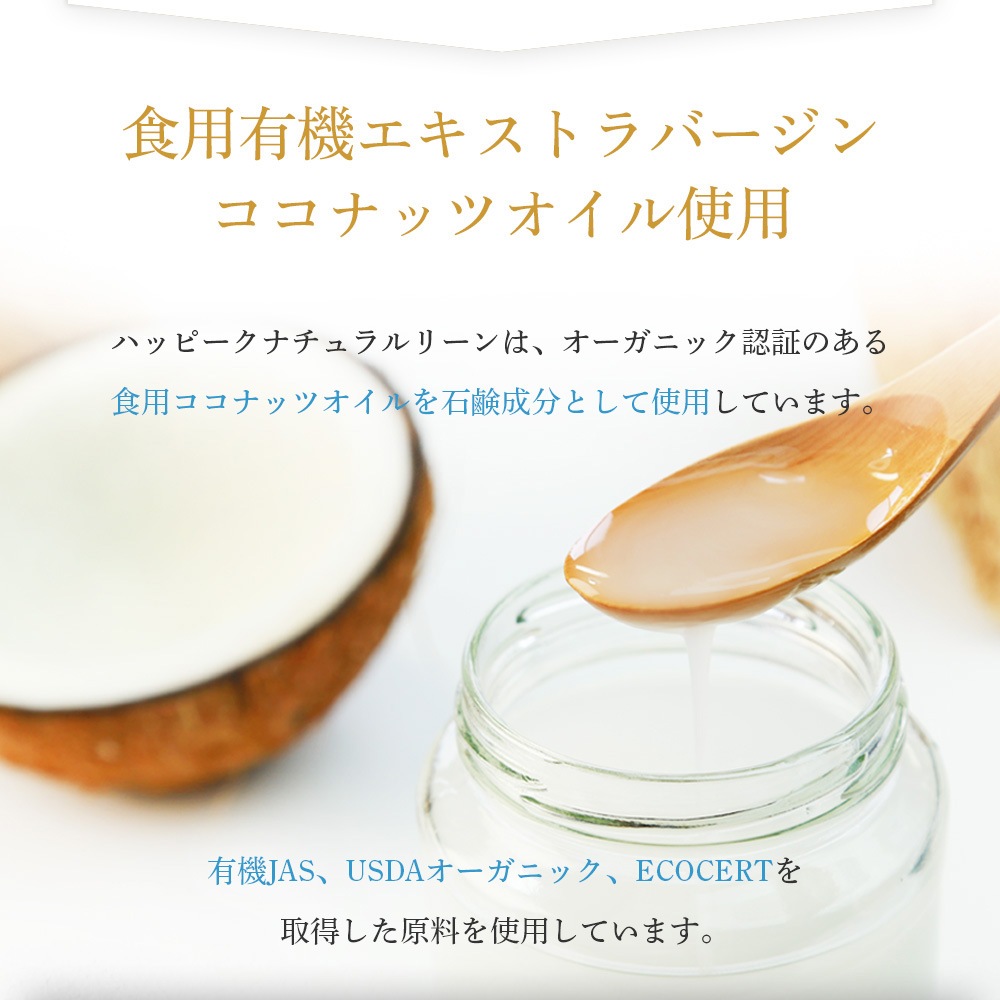 ハッピークリーンは、オーガニック認証のある食用ココナッツオイルを石鹸成分として使用しています。
