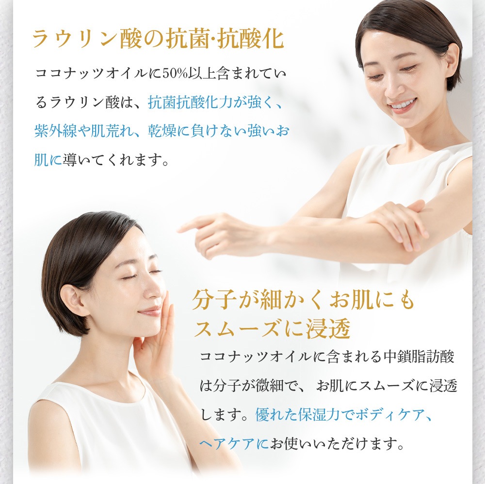 ココナッツオイルに含まれる中鎖脂訪酸は分子が微細で、 お肌にスムーズに浸透します。優れた保湿力でボディケア、ヘアケアにお使いいただけます。