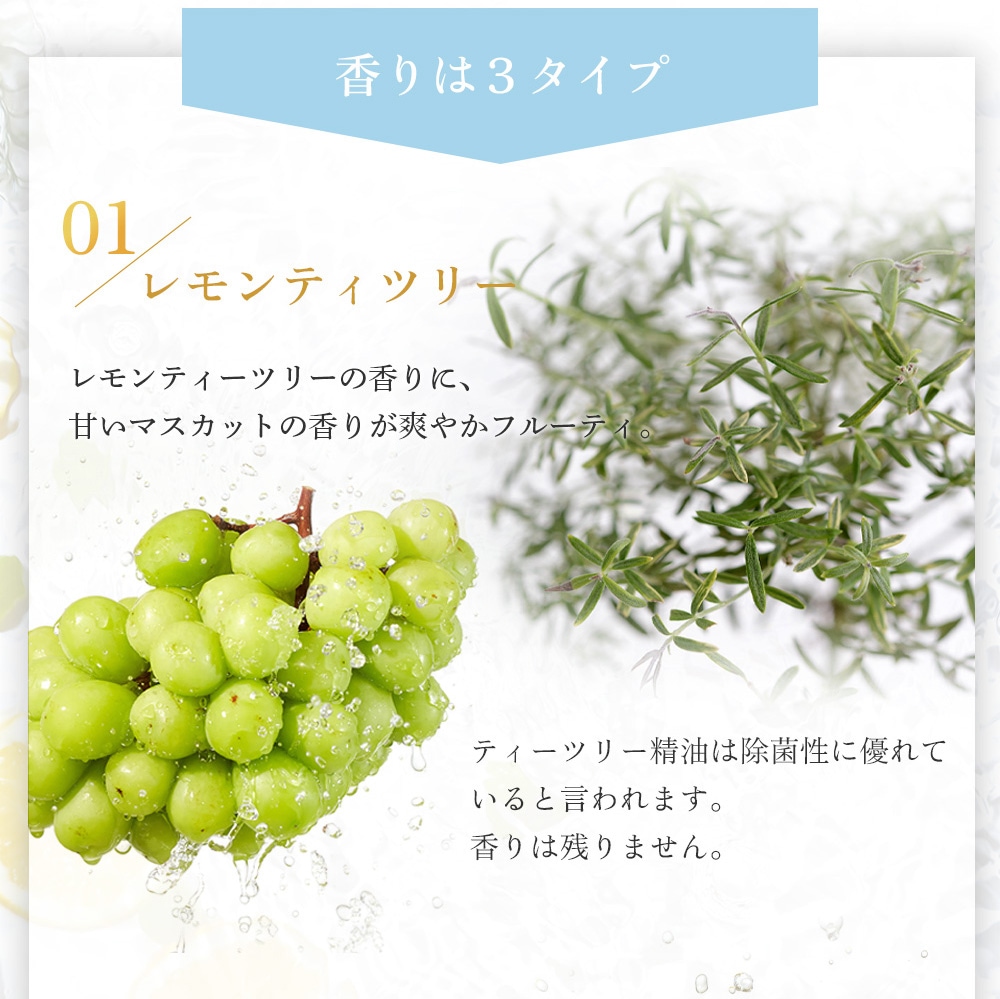 レモンティーツリーの香りに、甘いマスカットの香りが爽やかフルーティ。 ティーツリー精油は除菌性に優れていると言われます。香りは残りません。