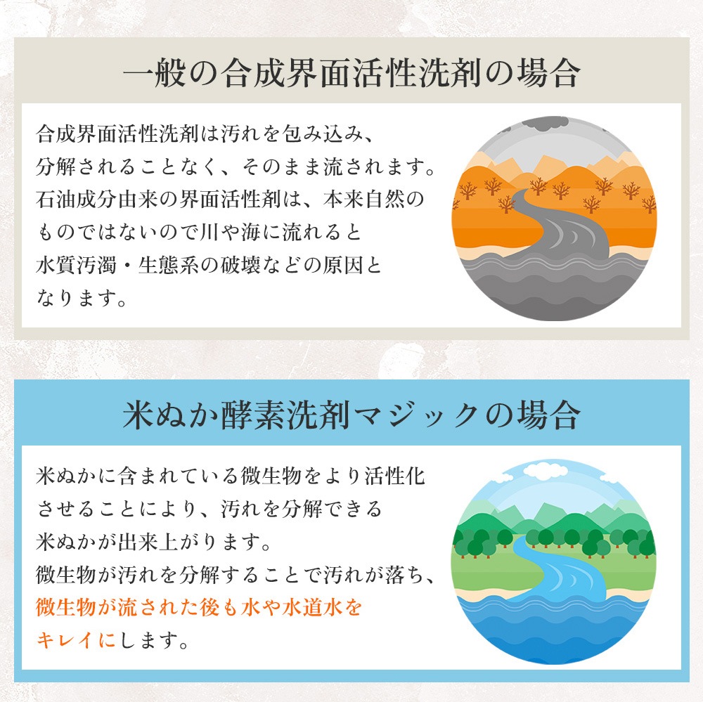 合成界面活性洗剤は汚れを包み込み、分解されることなく、そのまま流されます。石油成分由来の界面活性剤は、本来自然のものではないので川や海に流れると水質汚濁・生態系の破壊などの原因となります。
