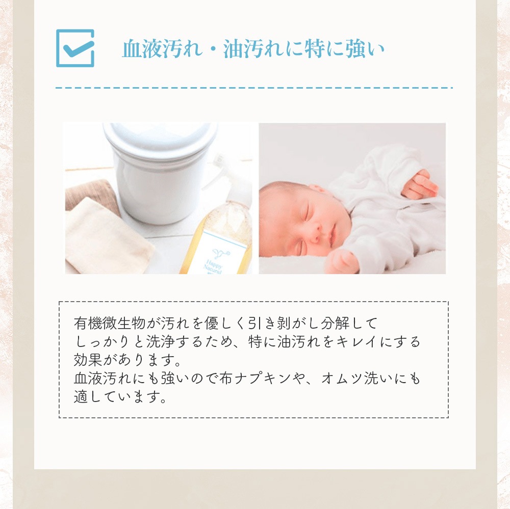 血液汚れにも強いので布ナプキンや、オムツ洗いにも適しています。