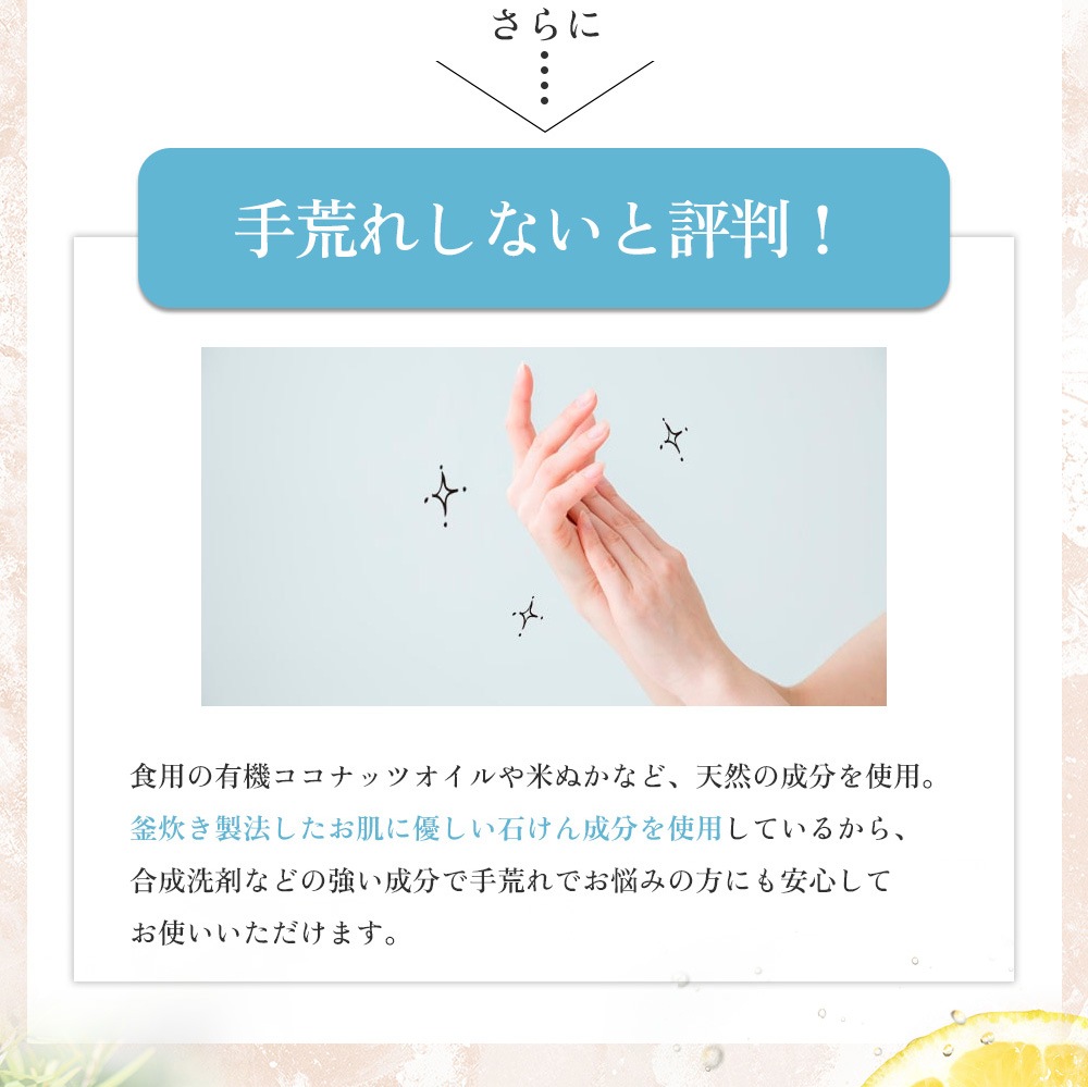 釜炊き製法したお肌に優しい石けん成分を使用しているから、合成洗剤などの強い成分で手荒れでお悩みの方にも安心してお使いいただけます。