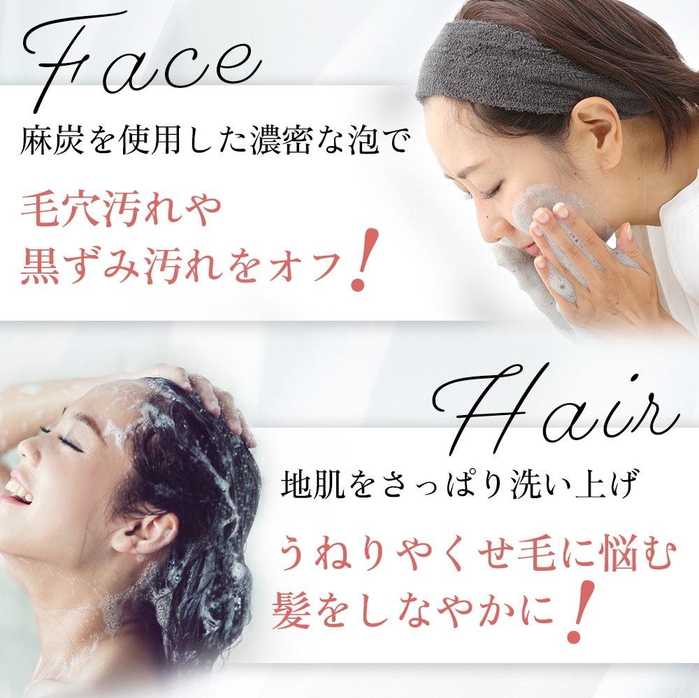 - 麻炭を使用した濃密な泡で毛穴汚れや黒ずみ汚れを簡単にオフし、透明感ある潤った肌に導きます