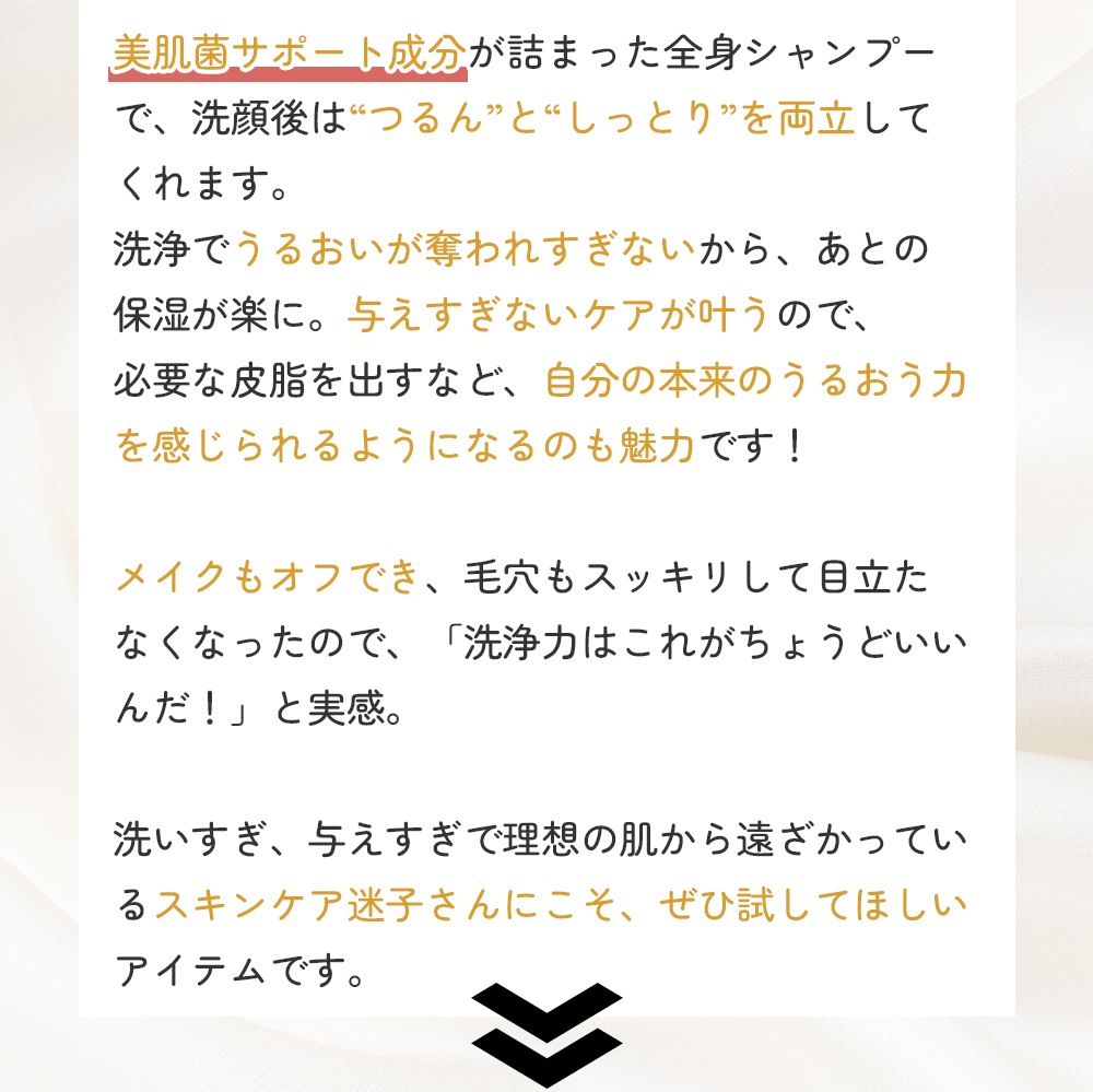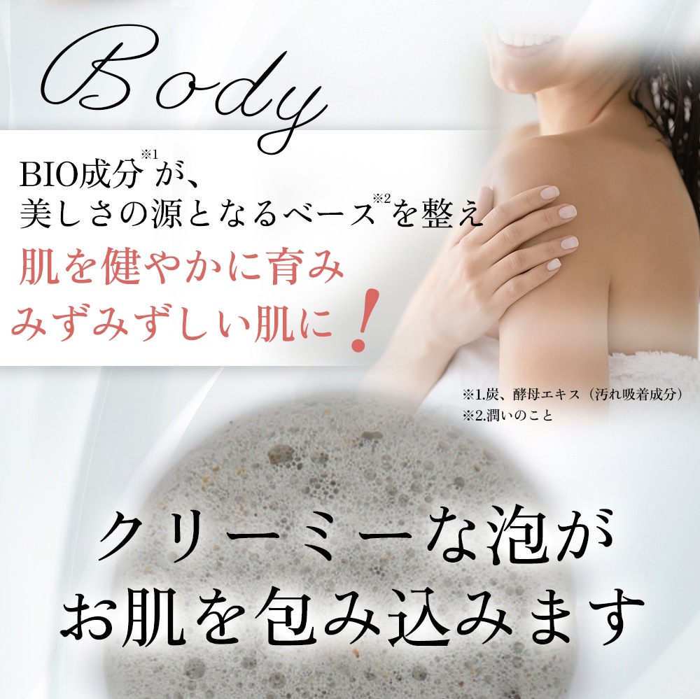 「Bio C.H.P WASH & SHAMPOO」は、美肌菌サポート成分が詰まった全身シャンプーで、洗顔後は“つるん”と“しっとり”を両立してくれます。