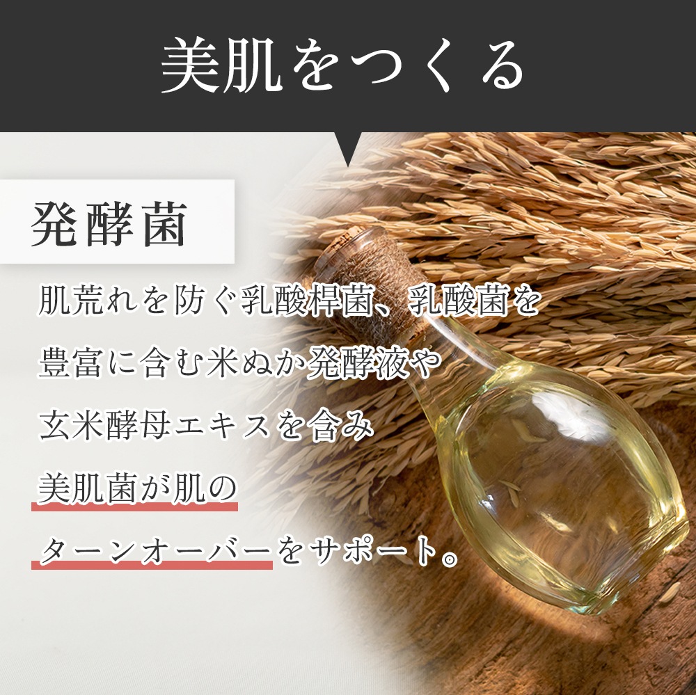肌荒れを防ぐ乳酸桿菌など、美肌菌が肌のターンオーバーをサポートします。 乳酸菌を豊富に含む米ぬか発酵液や玄米酵母エキスが、善玉菌が過ごしやすい潤い環境を守ります。