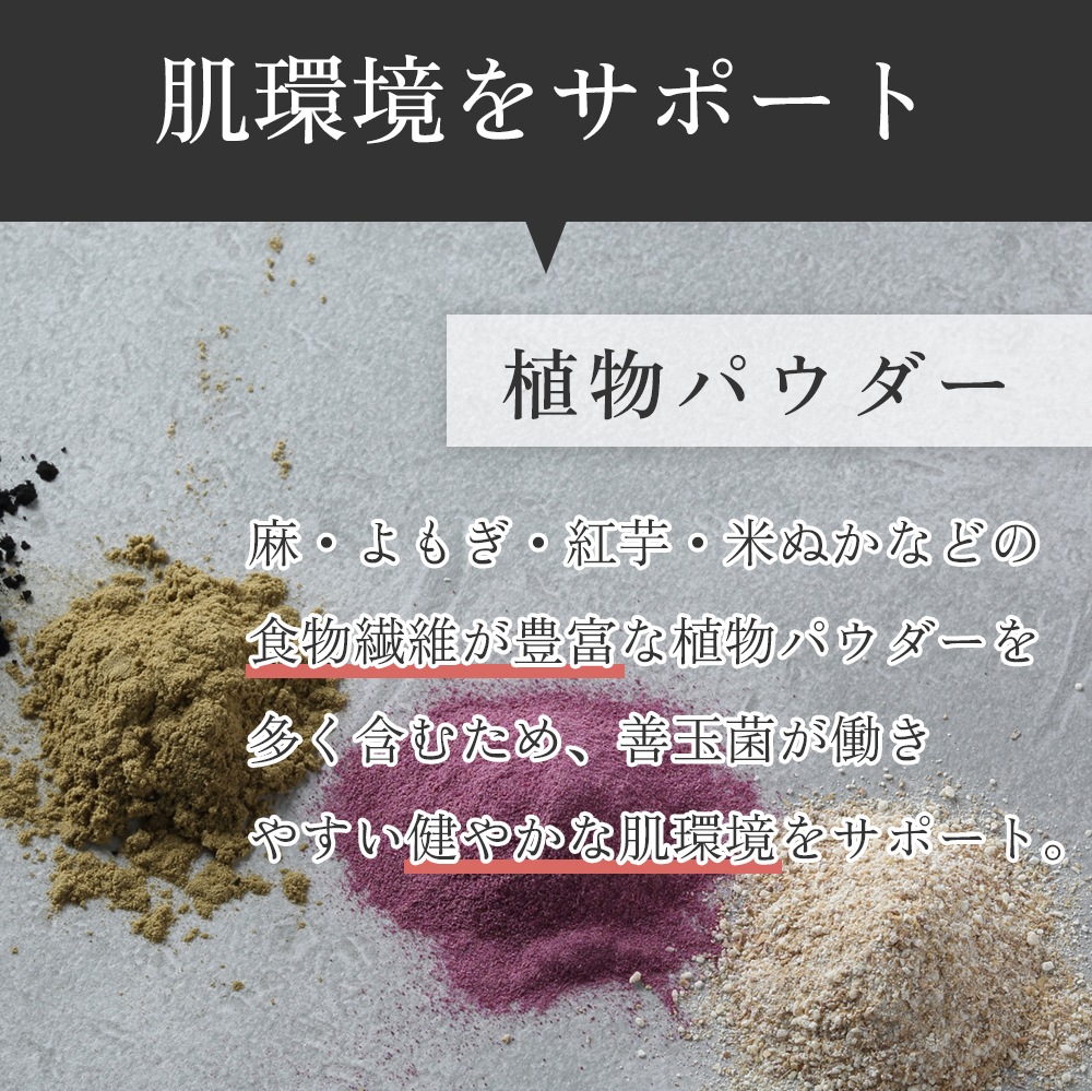 麻・よもぎ・紅芋・米ぬかなどの食物繊維が豊富な植物パウダーを多く含むため、善玉菌が働きやすい健やかな肌環境をサポート、美肌菌の活動を応援します。