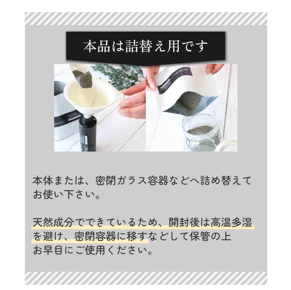 本体または、密閉ガラス容器などへ詰め替えてお使い下さい。