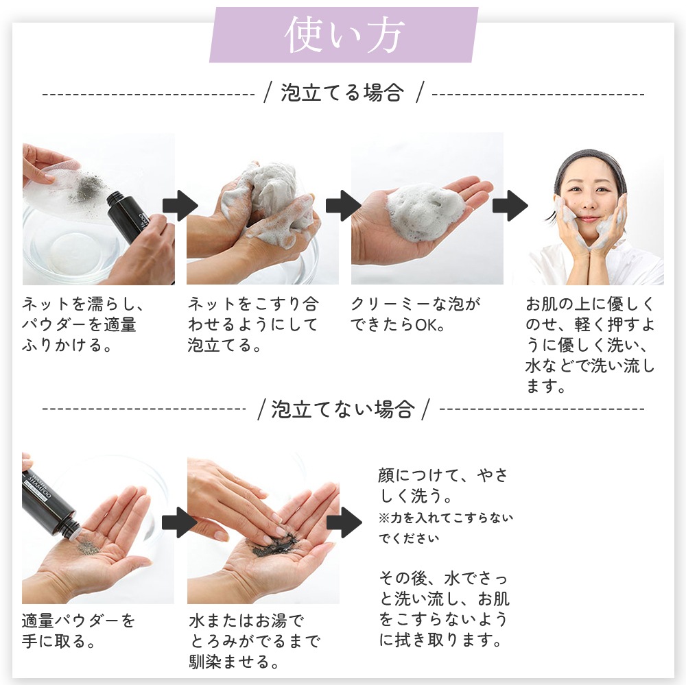 ![]() 5.お肌の上に優しくのせます。強くお肌をこすらず、軽く押すように優しく洗い、水などで洗い流します。 |