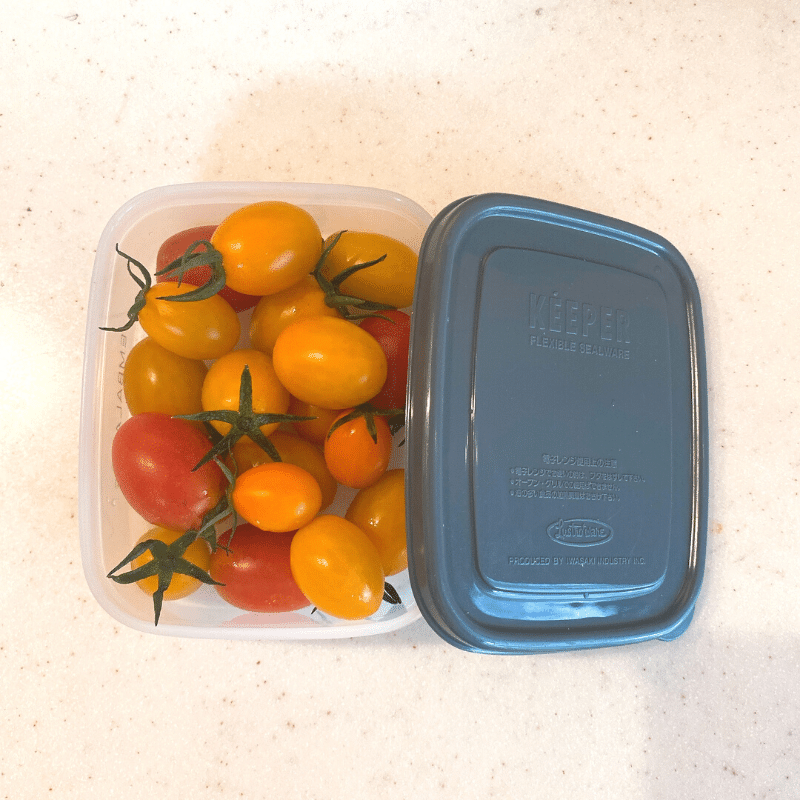 エンバランス角型保存容器370mlは、角型シリーズの中では一番小さいサイズ。ミニトマトは約20個入ります。