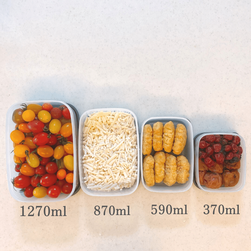 用途にわけて、小さいものから大きなものまですべてが使いやすく、ランチBOXとしても使えて、大き目のものも冷蔵庫に収まりやすい厚みで重ねて使っていますよ。