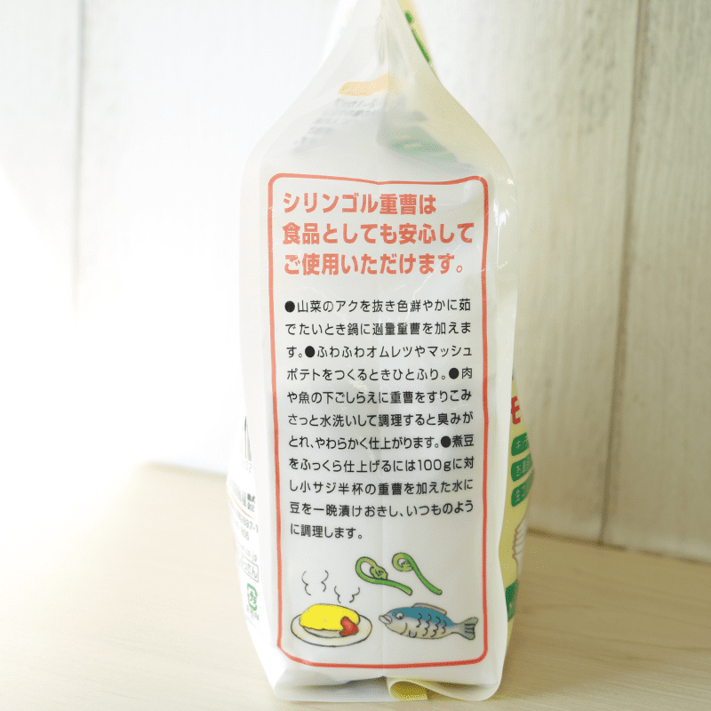 またシリンゴル重曹は食品用グレードですので野菜の灰汁抜き、お菓子のふくらし粉、スキンケアや歯磨き等にもご使用いただけます。