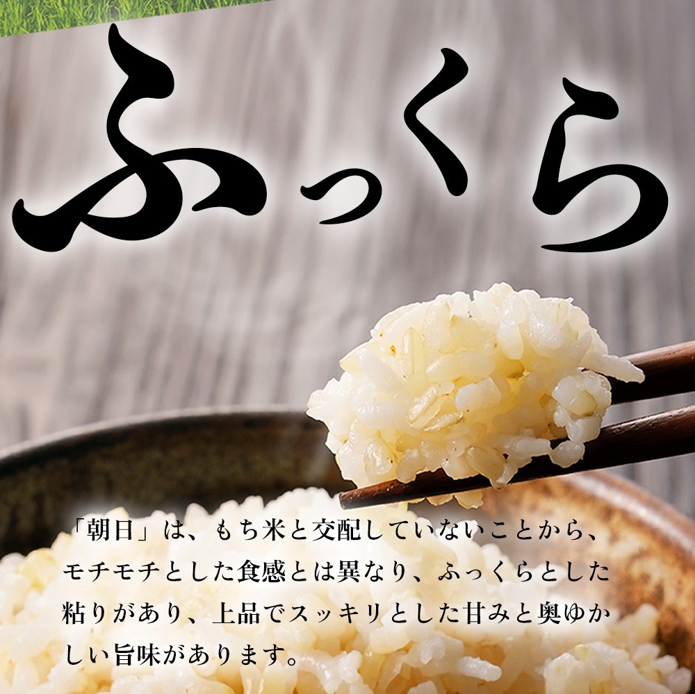 「朝日」は、もち米と交配していないことから、モチモチとした食感とは異なり、ふっくらとした粘りがあり、上品でスッキリとした甘みと奥ゆかしい旨味があります。