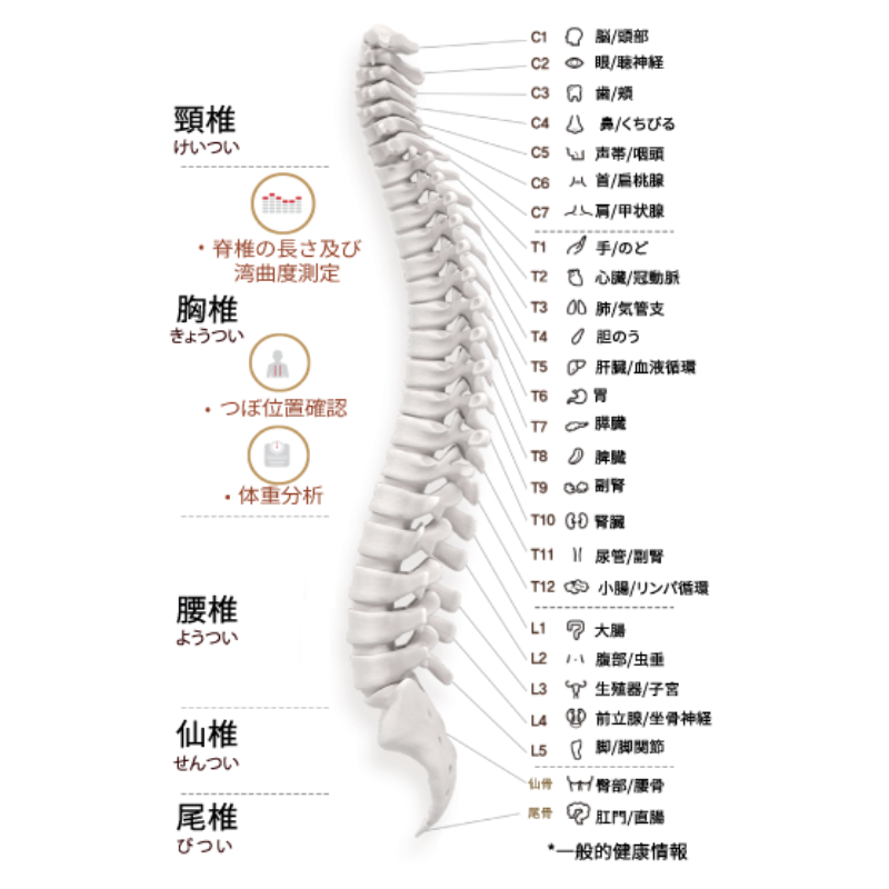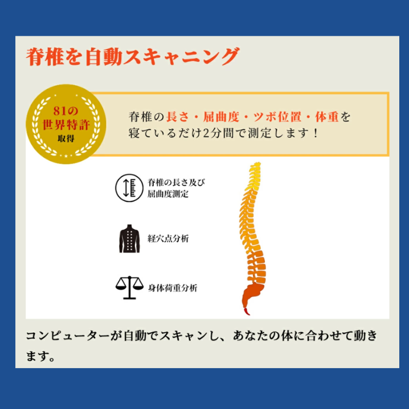 人それぞれ、背の高さが違うため背骨の長さも異なります。 背骨をスキャンすることで、貴方だけのオーダーメイドの施術をご提供します。
