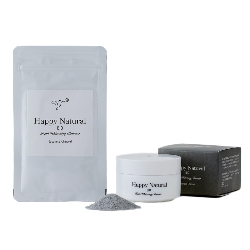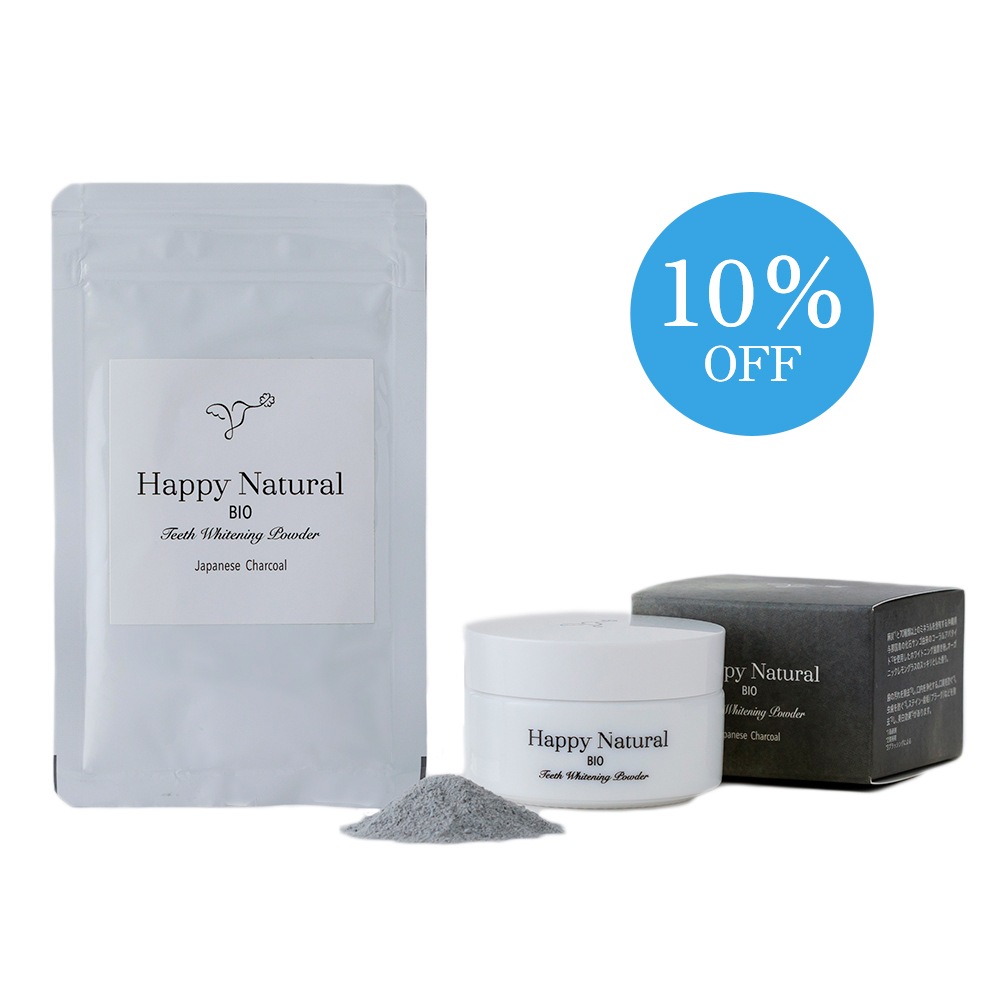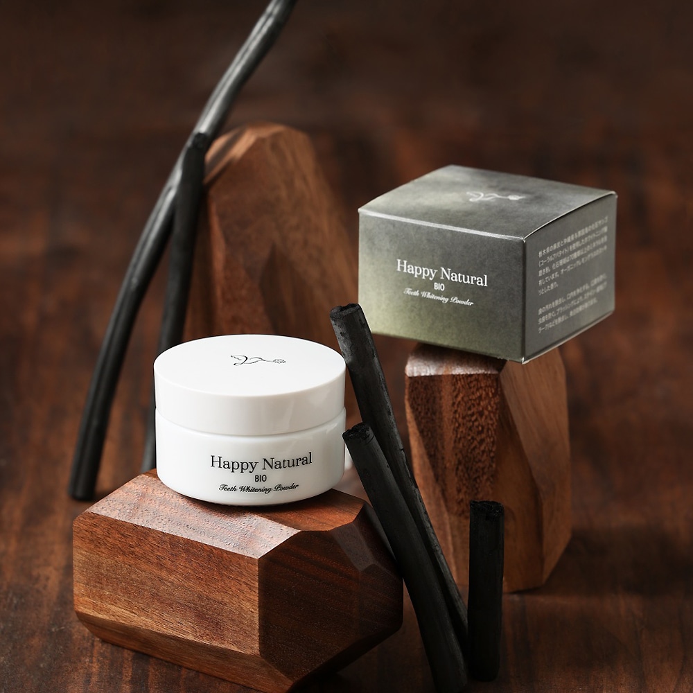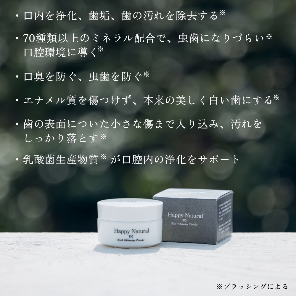 歯のエナメル質を傷つける恐れのある研磨剤は使用していません。 エナメル質が傷つくと、歯が白くなったとしても、汚れが付着しやすくなるためです。 ハッピーナチュラルの歯磨きパウダーは、麻炭や約5ミクロンの超微粉末パウダー天然アパタイトで汚れを吸着することで優しく落とします。※