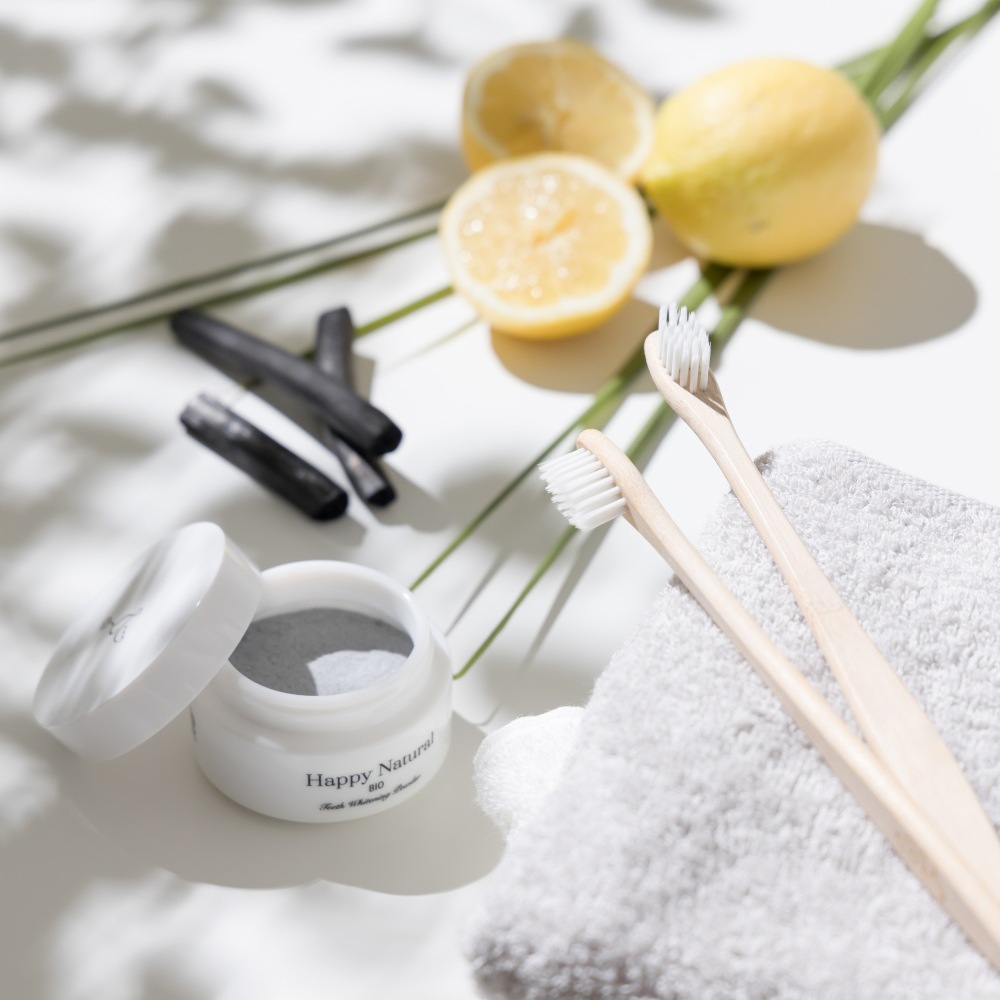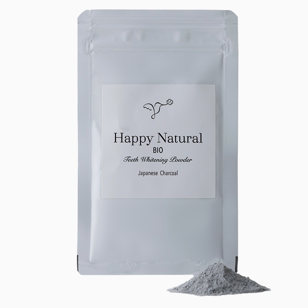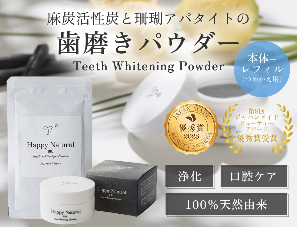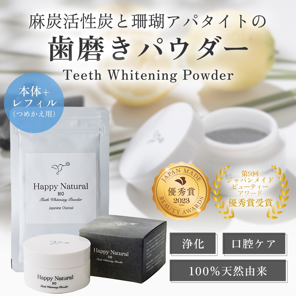 歯のエナメル質を傷つける恐れのある研磨剤は使用していません。 エナメル質が傷つくと、歯が白くなったとしても、汚れが付着しやすくなるためです。 ハッピーナチュラルの歯磨きパウダーは、麻炭や約5ミクロンの超微粉末パウダー天然アパタイトで汚れを吸着することで優しく落とします。※