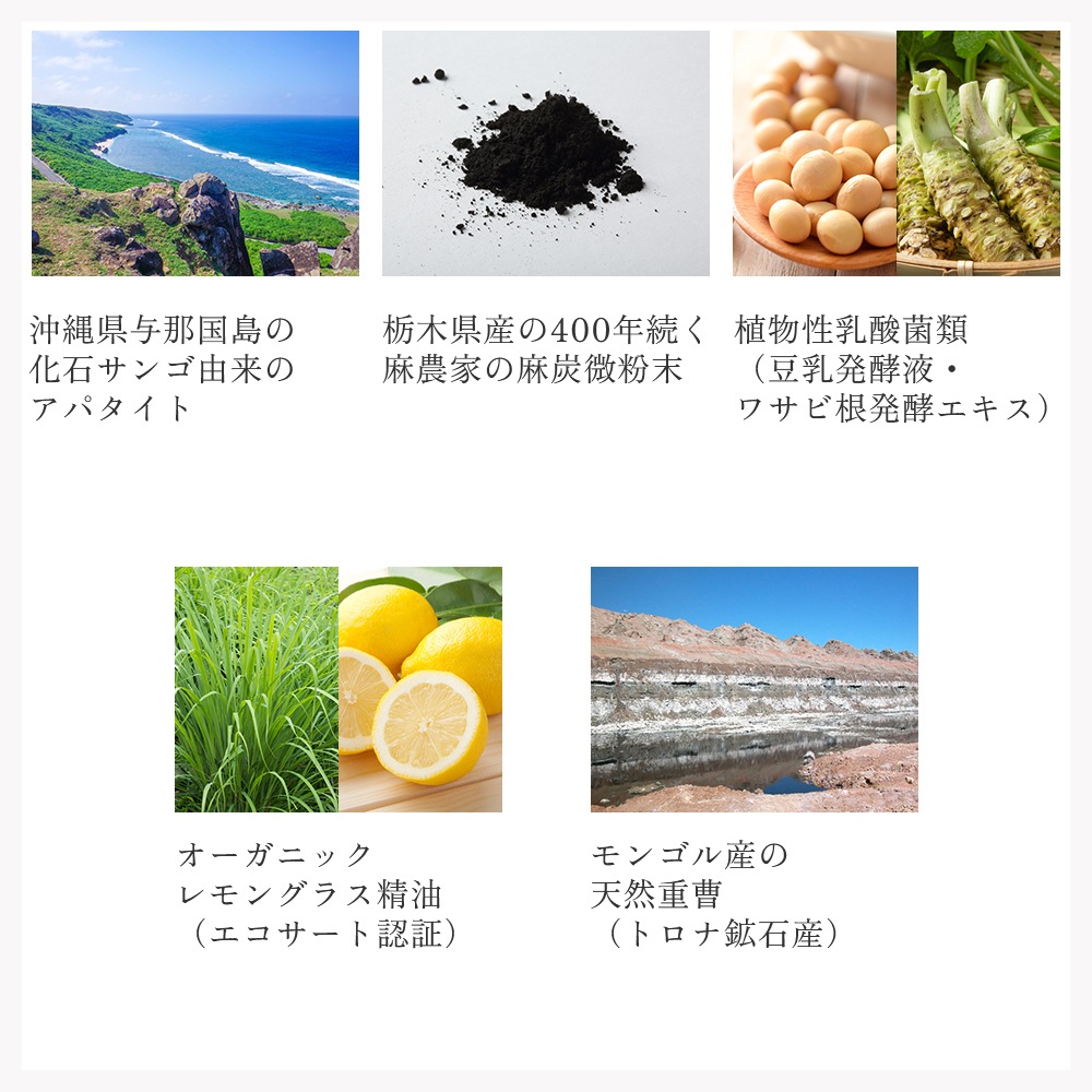 天然の吸着成分である麻炭、コーラルアパタイト、天然重曹などの全て天然の清掃剤で 汚れをしっかり落とします※。全成分天然由来です。