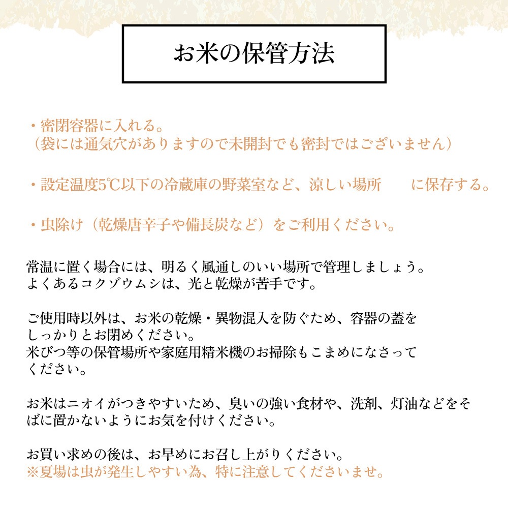 ※お米は高温・多湿・酸化を嫌います。気になる方は、鷹の爪・ニンニク等対策グッズの活用や冷蔵保存をお勧めします。