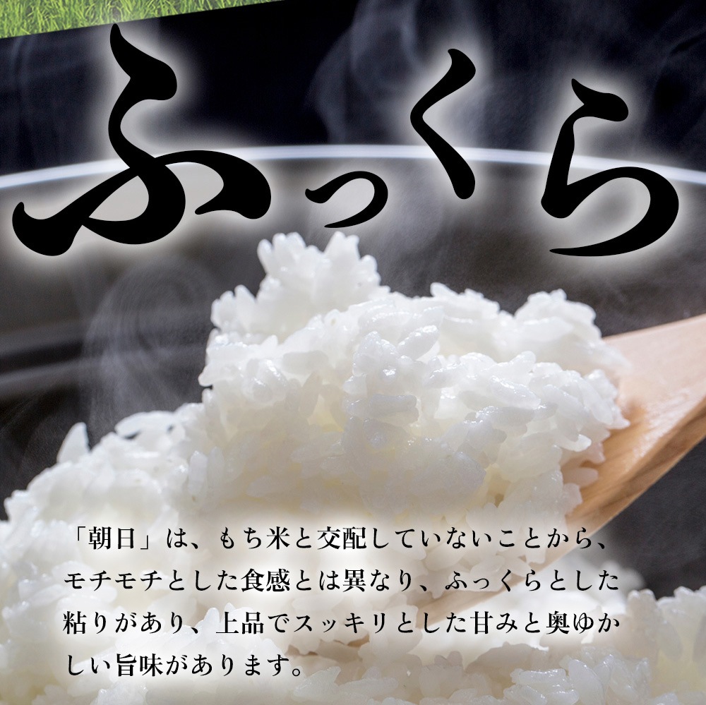 「朝日」は、もち米と交配していないことから、モチモチとした食感とは異なり、ふっくらとした粘りがあり、上品でスッキリとした甘みと奥ゆかしい旨味があります。