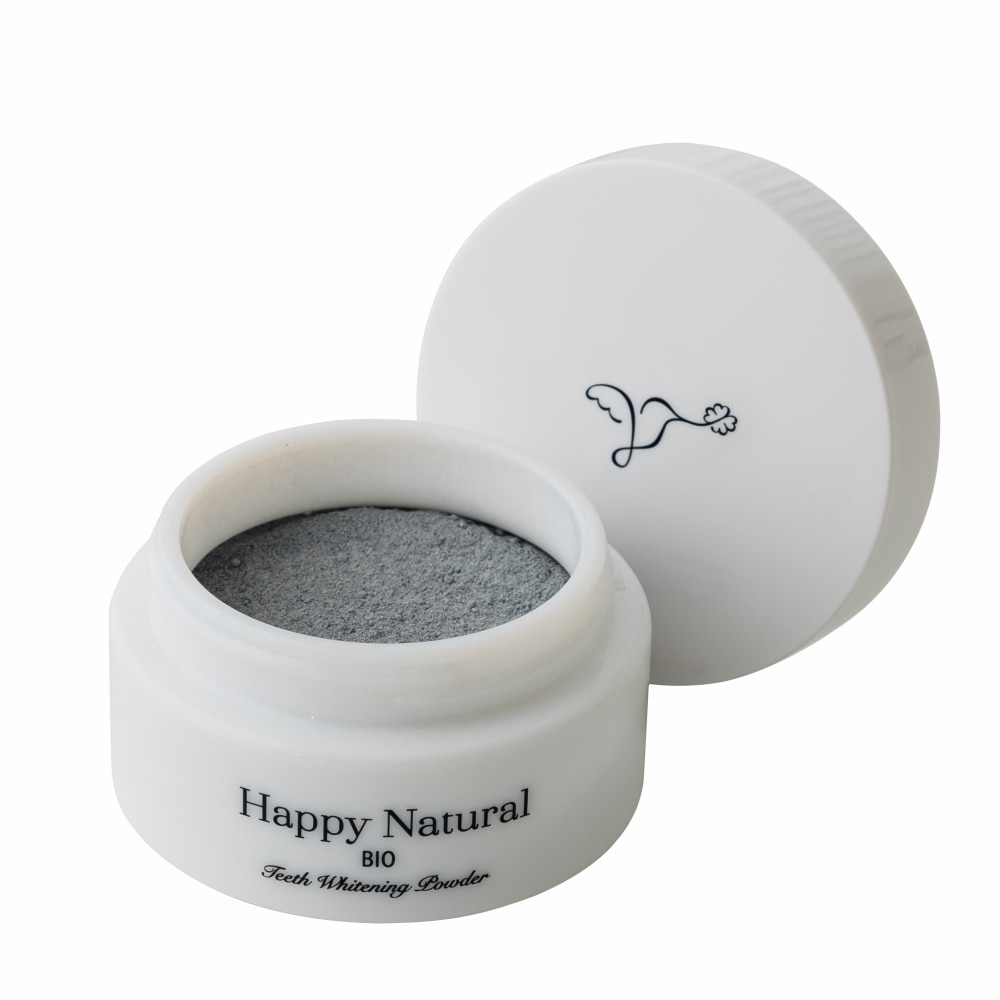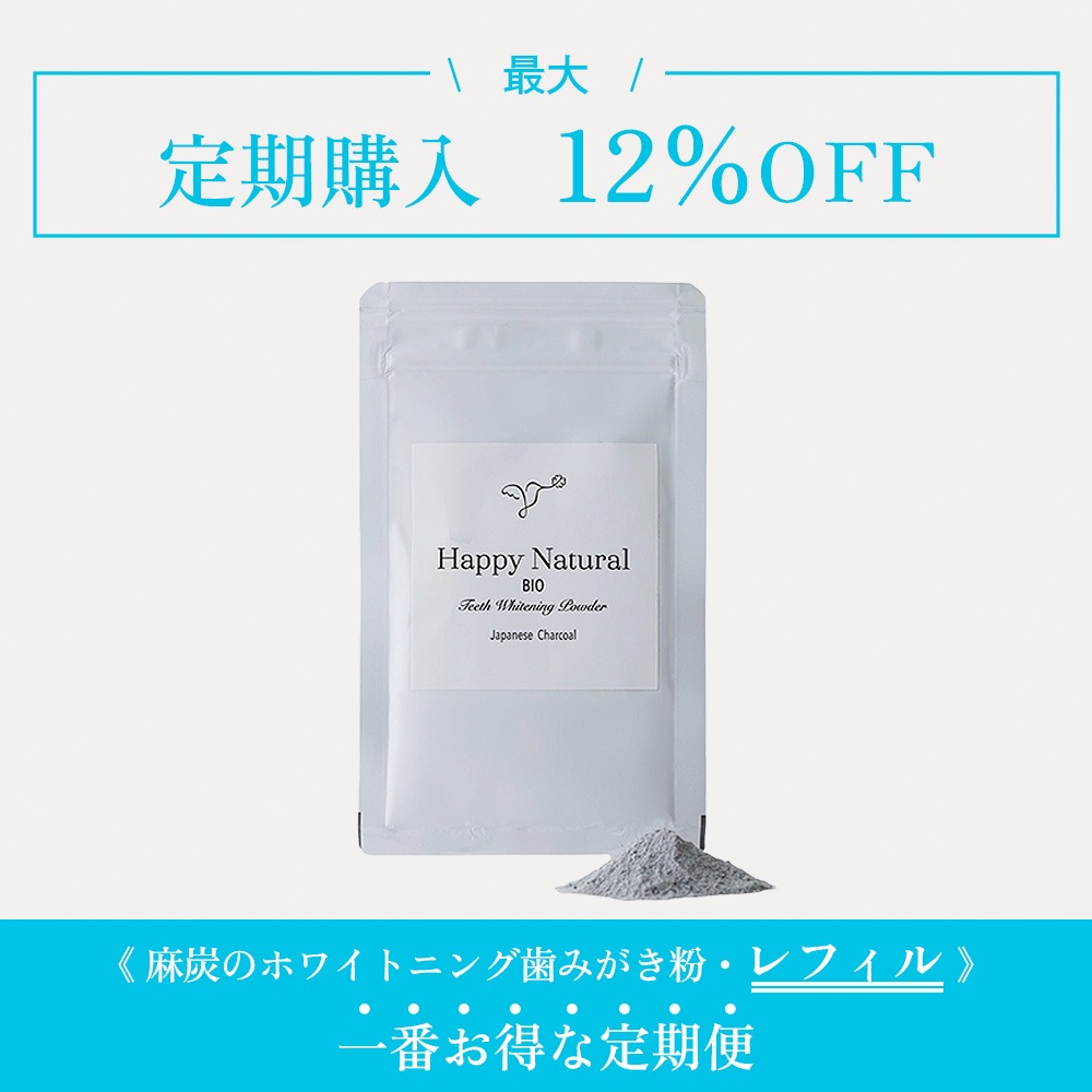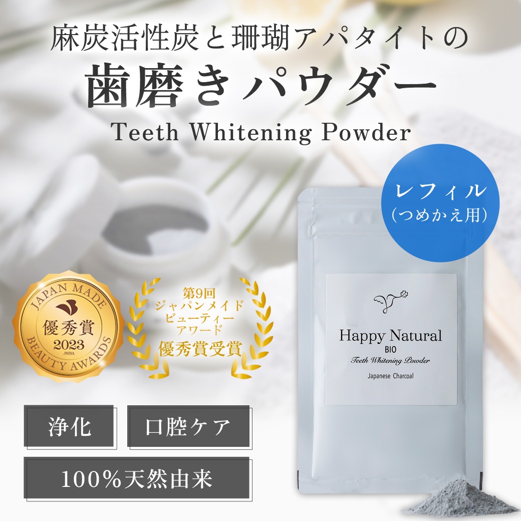 歯のエナメル質を傷つける恐れのある研磨剤は使用していません。 エナメル質が傷つくと、歯が白くなったとしても、汚れが付着しやすくなるためです。 ハッピーナチュラルの歯磨きパウダーは、麻炭や約5ミクロンの超微粉末パウダー天然アパタイトで汚れを吸着することで優しく落とします。※