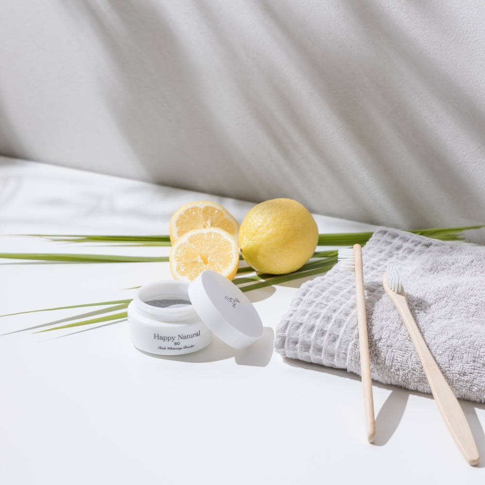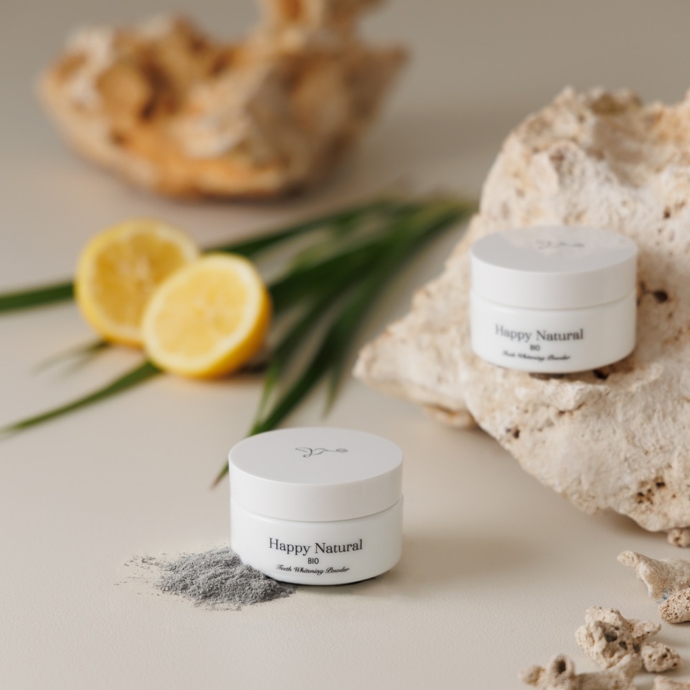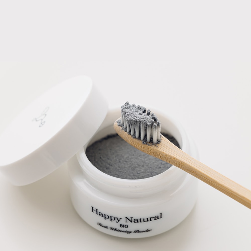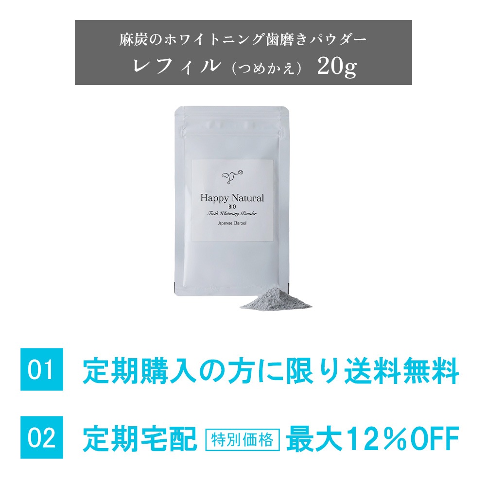歯のエナメル質を傷つける恐れのある研磨剤は使用していません。 エナメル質が傷つくと、歯が白くなったとしても、汚れが付着しやすくなるためです。 ハッピーナチュラルの歯磨きパウダーは、麻炭や約5ミクロンの超微粉末パウダー天然アパタイトで汚れを吸着することで優しく落とします。※