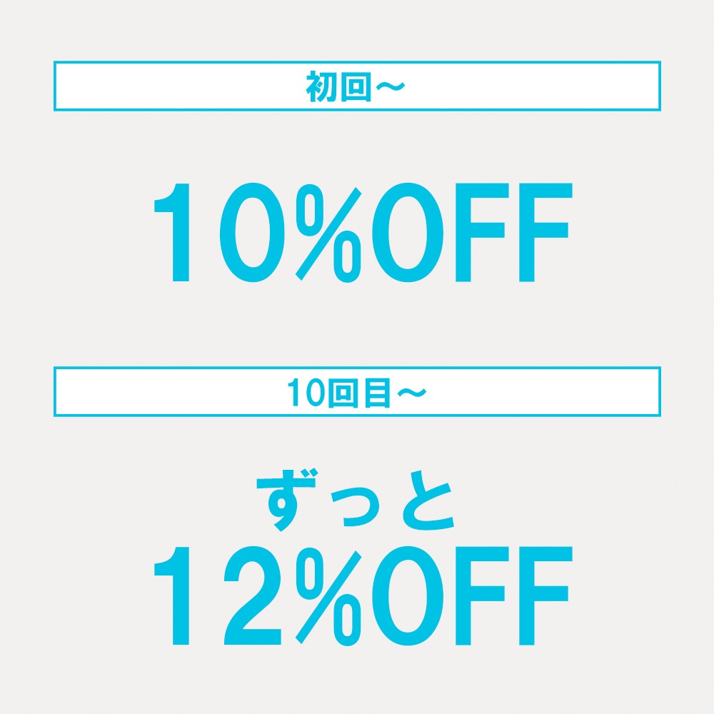 初回から9回目まで10%オフ、10回目以降ずっと最大12%オフとなります。