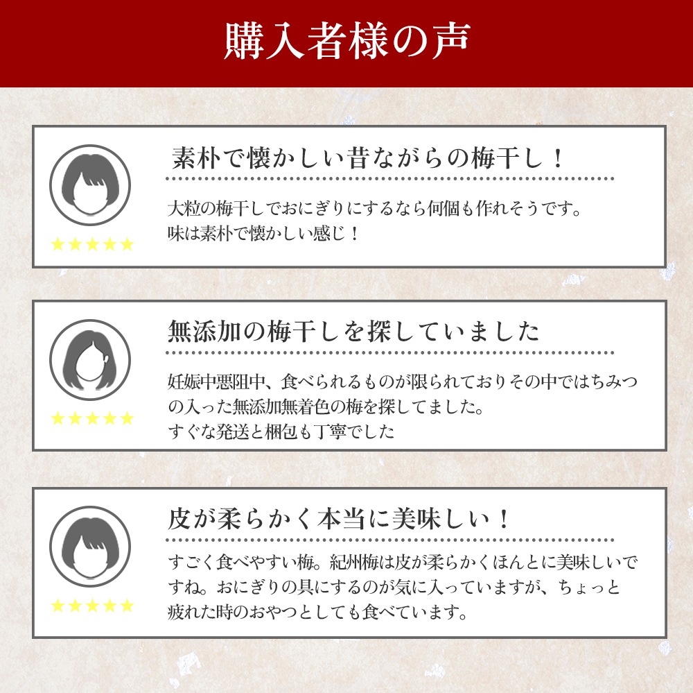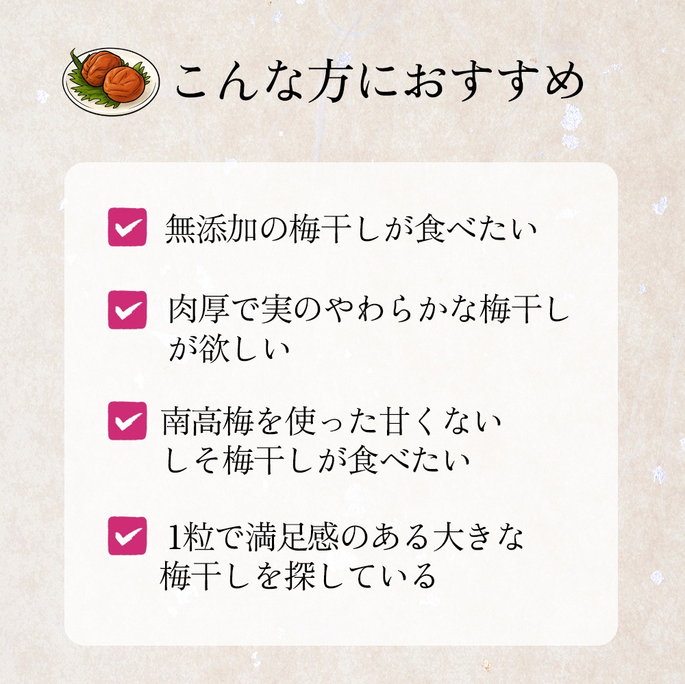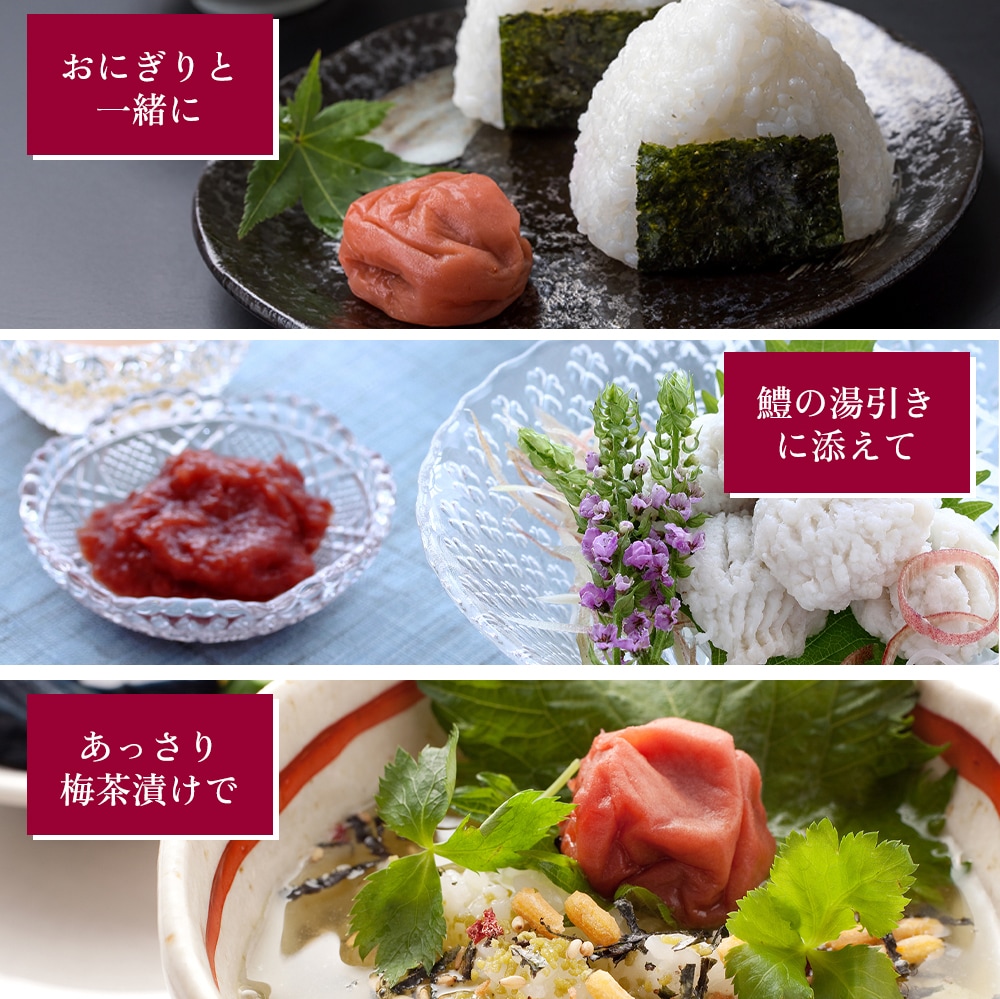 素材にこだわり、保存料・着色料・化学調味料など一切使用していない梅本来の味を生かしながら後味良く仕上げています。