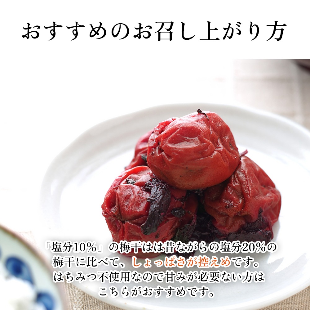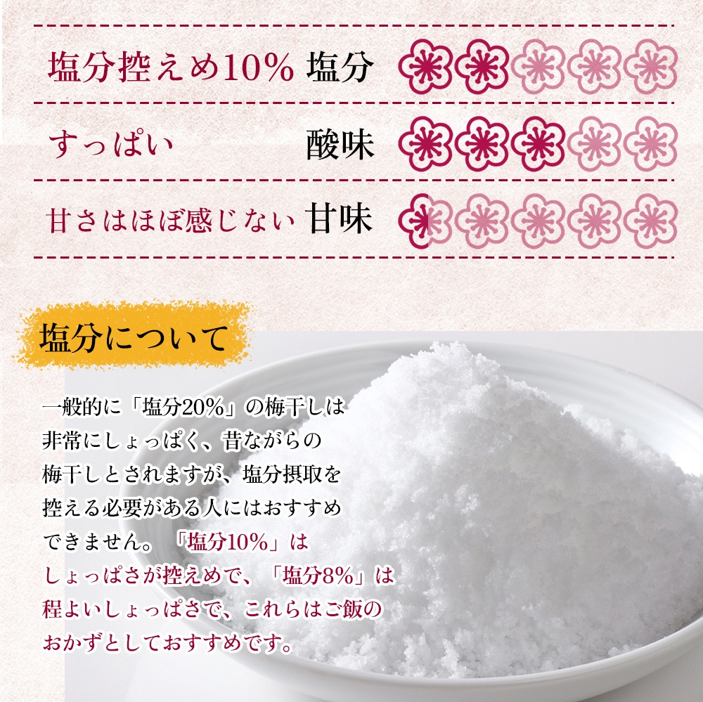 「塩分10%」の梅干はは昔ながらの塩分20%の梅干に比べて、しょっぱさが控えめです。