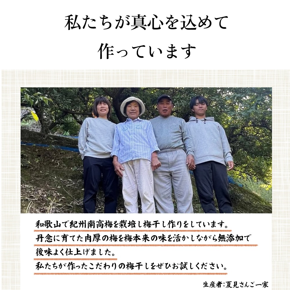 和歌山の紀中の山村で育った完熟の南高梅を使用した愛情たっぷりの梅干しです。 自家栽培の紀州南高梅と100%純国産はちみつを使用しています。