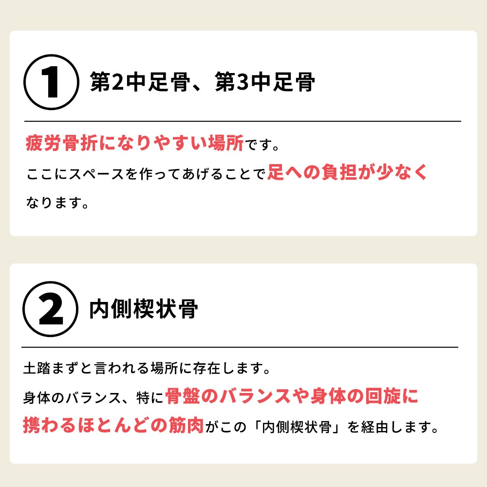 疲労骨折になりやすい場所です。 ここにスペースを作ってあげること で足への負担が少なくなります。