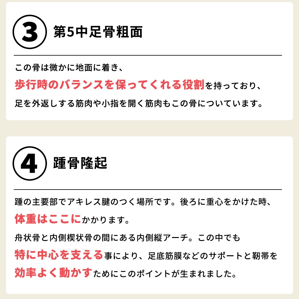 この骨は微かに地面に着き、歩行時のバランスを保ってくれる役割を持っており、足を外返しする筋肉や小指を開く筋肉もこの骨についています。