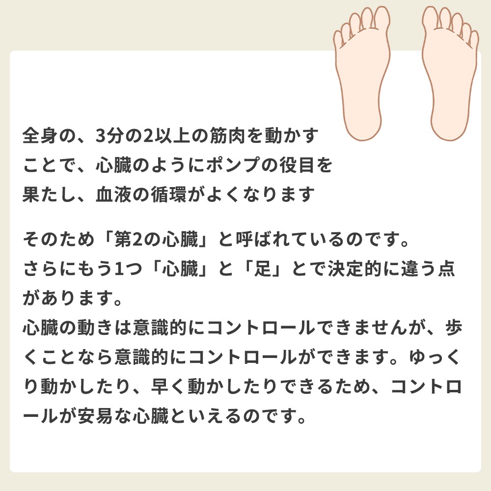 心臓の動きは意識的にコントロールできませんが、歩くことなら意識的にコントロールができます。ゆっくり動かしたり、早く動かしたりできるため、コントロールが安易な心臓といえるのです。