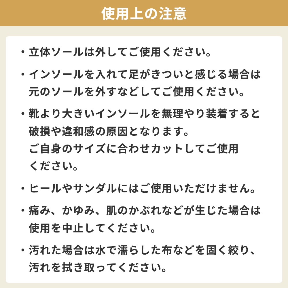 - 靴より大きいインソールを無理やり装着すると破損や違和感の原因となります。ご自身のサイズに合わせカットしてご使用ください。