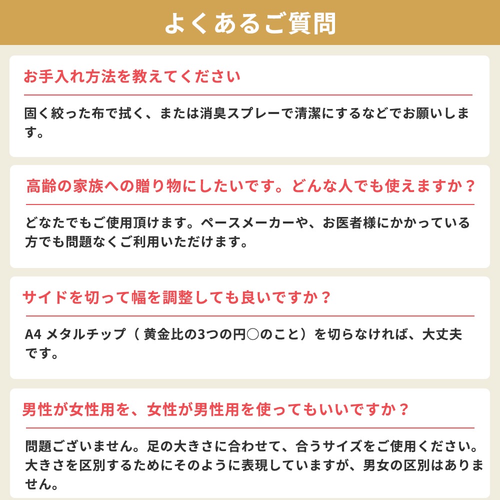 - 靴下の中に入れてしまうと、転んで怪我をされる事も十分に考えられますので、室内の場合はスリッパなどの上に敷いてご使用ください。