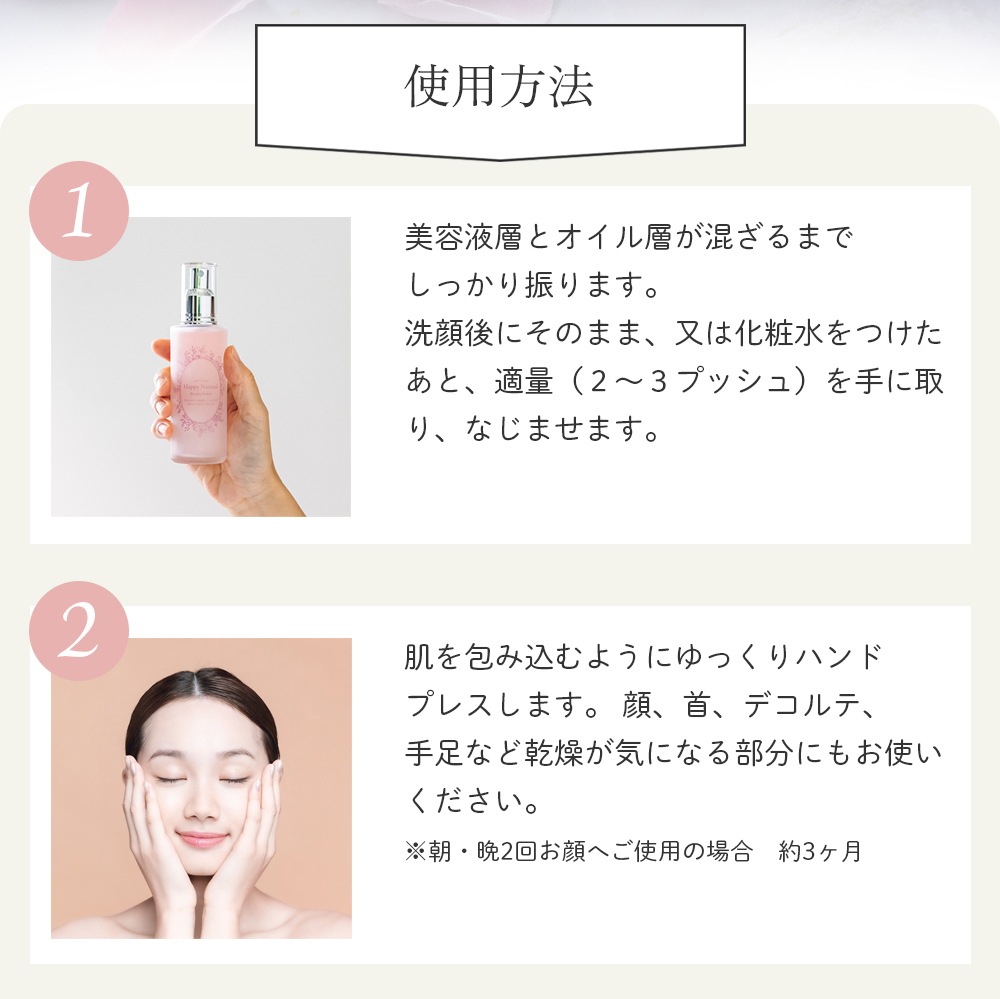 オイルと美容液の2層式オイルは、潤いとハリを同時にお肌に与えることができます。 水分を補給しながら、オイルで潤いをキープできるので、1つで潤いのある艶肌になります。 化粧水、美容液、オイルケアがこれ1本で完成。
